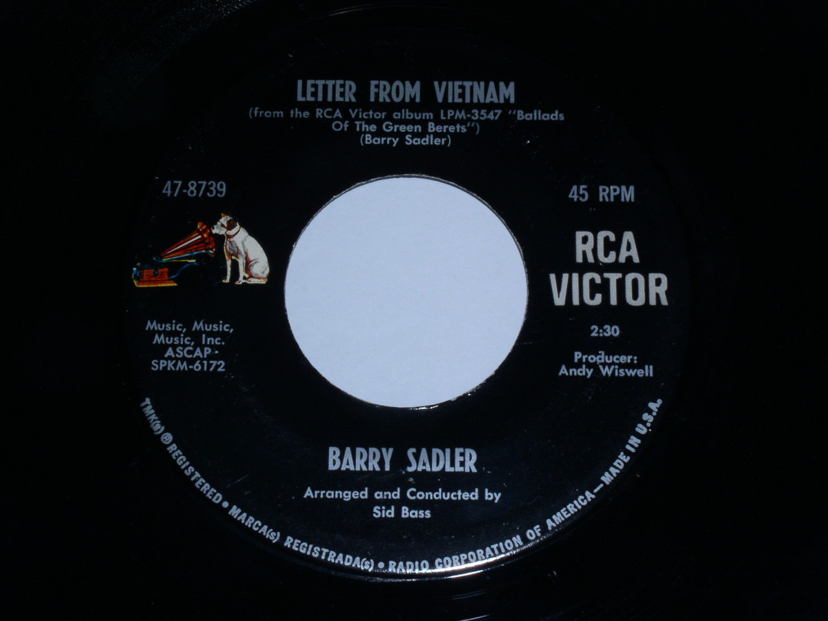 This is the original vintage 45 rpm phonograph record by Barry Sadler entitled, "The Ballad Of The Green Berets". Flipside: "Letter From Vietnam". Record label, RCA 47-8739.
