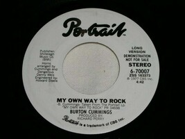 This is the original, vintage, promotional 45 rpm phonograph record by Burton Cumming entitled, "My Own Way To Rock". This is the long/short issue. Record label Portrait 6-70007.