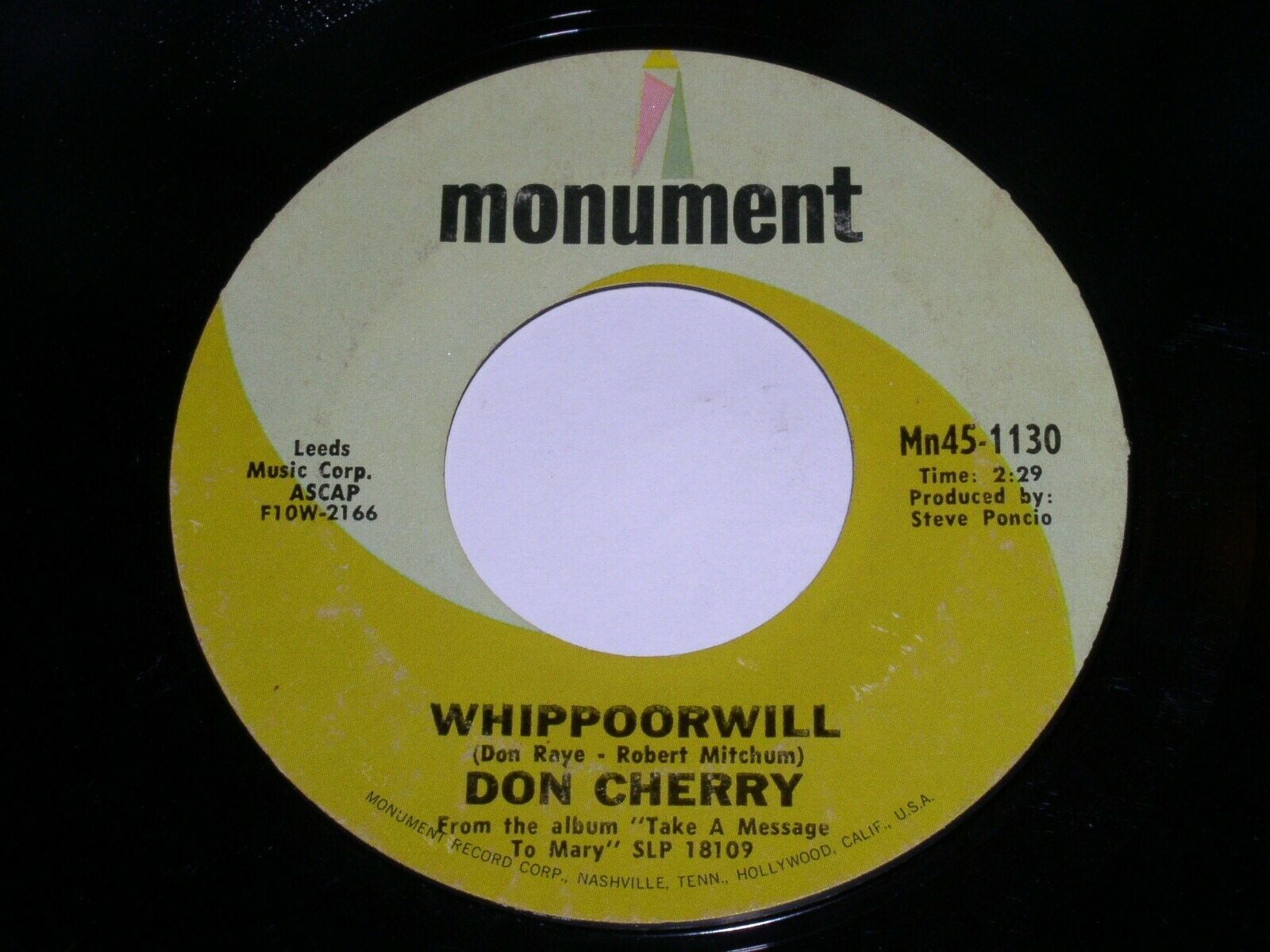 This is an original, vintage 45 rpm phonograph record by Don Cherry entitled, "Whippoorwill". Flipside: "To Think You've Chosen Me". Record label Monument MN45-1130.