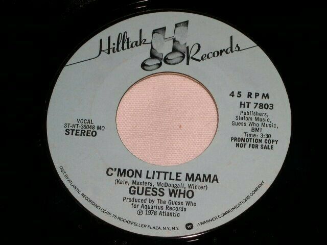 This is the original, vintage, promotional 45 rpm phonograph record by The Guess Who entitled, "C'Mon Little Mama". This is the mono/stereo issue. Record label: Hilltak HT 7803.