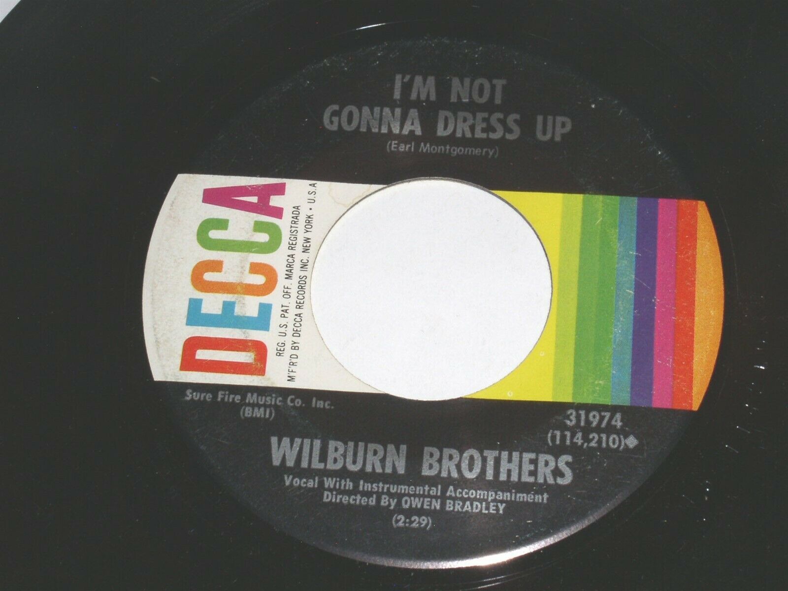 This is an original, vintage 45 rpm phonograph record by Wilburn Brothers entitled, "I can't Keep Away From You". Flipside: "I'm Not gonna Dress Up". Record label Decca 31974.