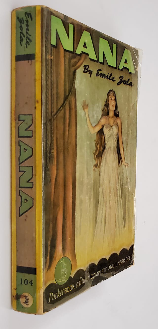 Nana by Emile Zola. Published by Pocket Books in 1941. Nana tells the story of Nana Coupeau's rise from streetwalker to high-class cocotte during the last three years of the French Second Empire. Nana first appears in the end of L'Assommoir (1877), another of Zola's Rougon-Macquart series, in which she is portrayed as the daughter of an abusive drunk; in the end, she is living in the streets and just beginning a life of prostitution. Pages are browning with age. Name written inside front cover, otherwise pages are clean. Cover has scuffing and plastic overlay is starting to lift. Cover is also slightly soiled.