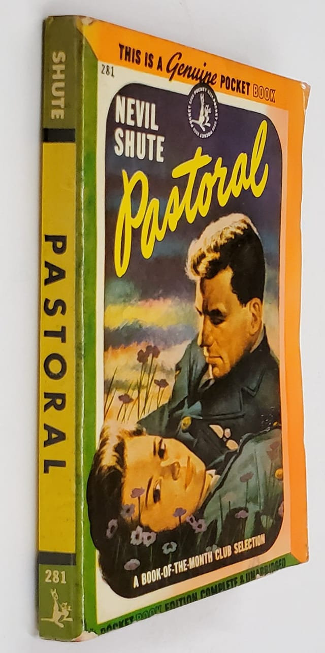 Pastoral by Nevil Shute. Published by Pocket Books in 1946. This is a pastoral idyll of a bomber base! The bomber crew who are the central characters are ardent, though rather amateurish, fishermen, from the pilot captain down. Their enthusism has been one factor welding them into a team that has accomplished some fifty odd operations, virtually unscathed. Enter Gervase, homesick WAAF officer, who puts her job first but finds her heart won by the pilot's ingenuous admiration, and gives him 'the gate' - at cost to them both. A charmingly told tale of young love in the midst of war. Pages are brown with age. Outer edge of pages and cover got wet. There is some scuffing and soiling.