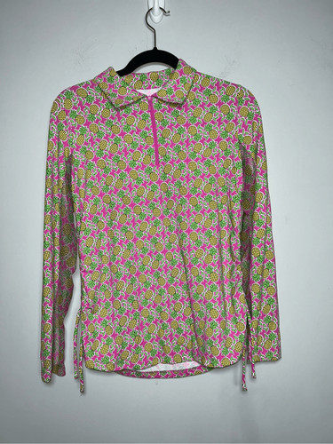 It has a zip placket, a mock collar and mesh running under the sleeves. The ICE FIL fabric is 92% Nylon 8% Polyurethane which is designed to keep you cool. It is soft and stretchy, wicks the moisture from sweat, has 50+ UPF sun protection, is fast drying and retains it shape after washing.