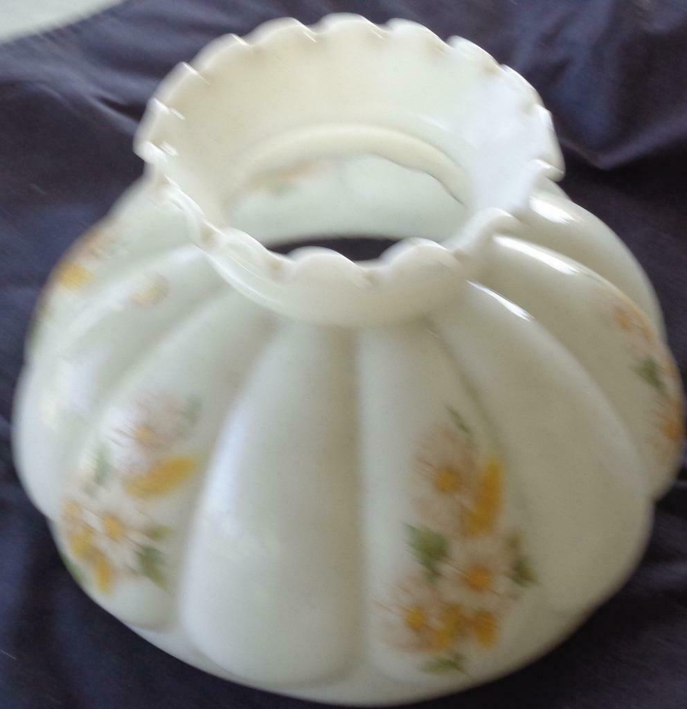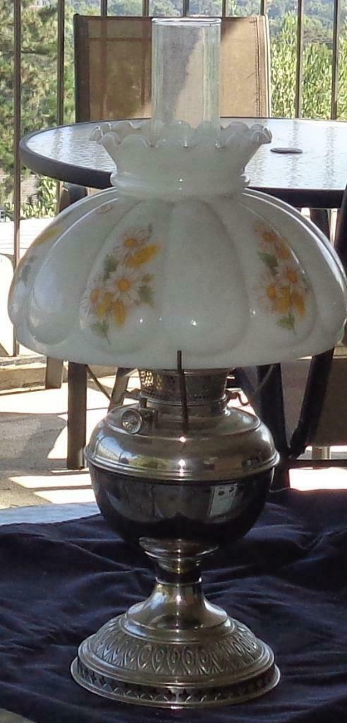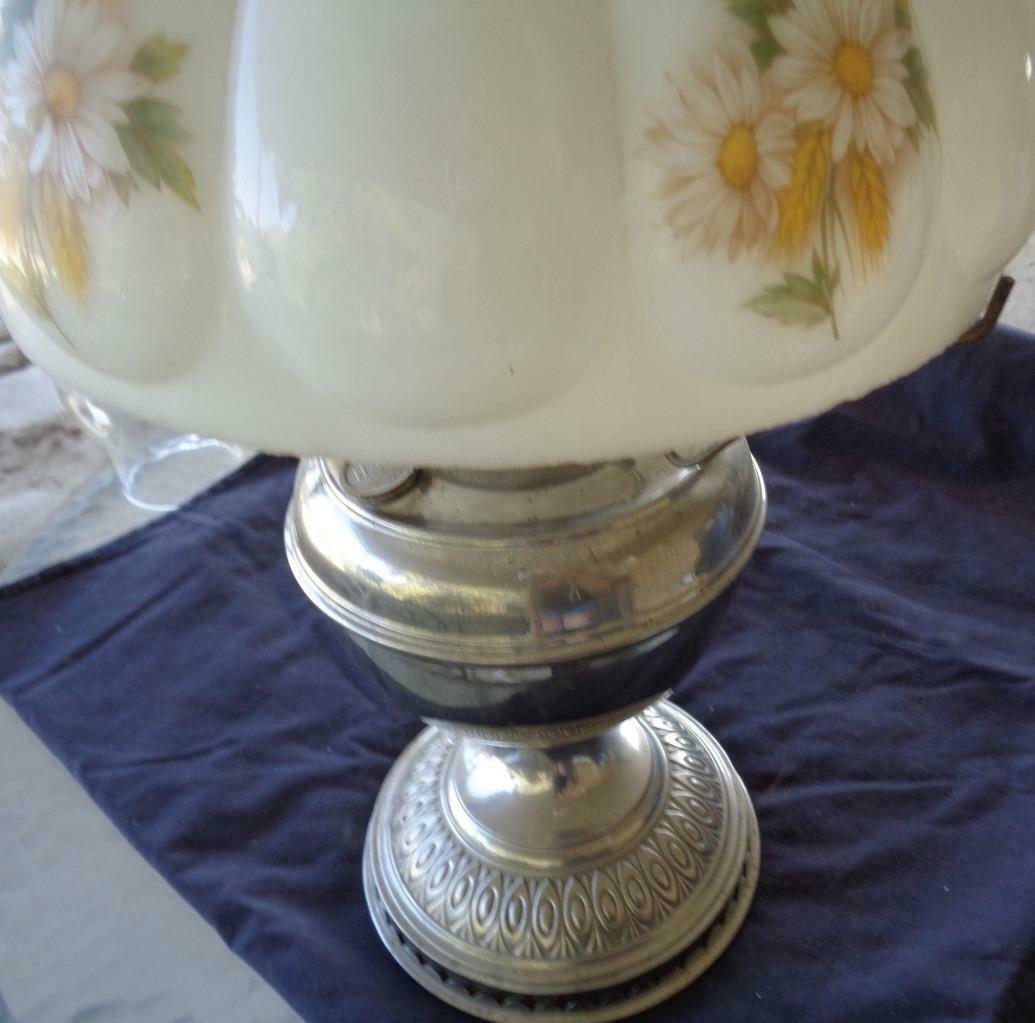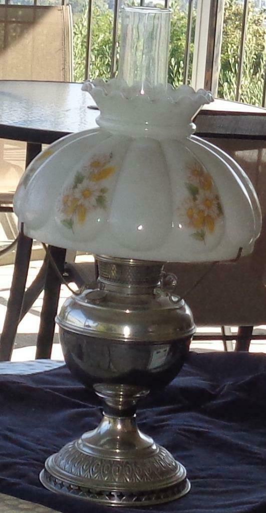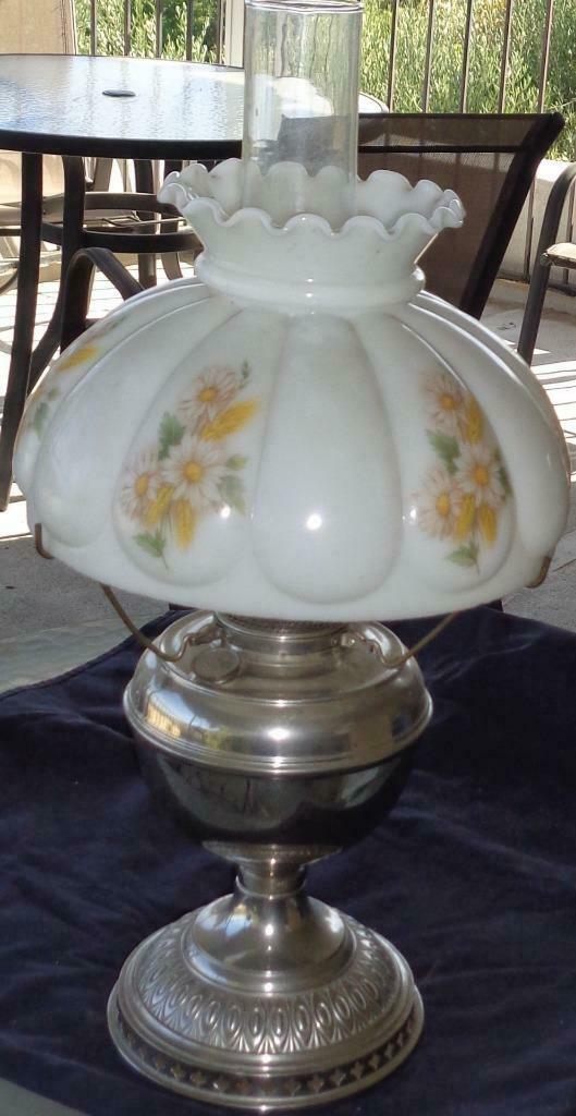 Offered here is this Antique Silverplated Liquid Lamp. The lamp is in good condition, although I am unsure of its exact age. It does have a few small dents in the sides, but is otherwise in great, working condition. There is some wear and slight tarnishing to the finish. It could use a good polishing. The lamp comes with a clear glass chimney that is 10” tall, and a gorgeous milk glass shade that has a floral transfer pattern on it. The chimney is in very good condition, with no chips or cracks, and the shade is also in good condition, although while having no cracks, or chips, is does have a lot of flea bite chips around the bottom rim. This is probably natural since it fits onto metal brackets that attach to the lamp. The shade is about 10” in diameter at the base, about 12” in diameter at the width of its curve, about 5.25” in diameter at the top ruffle rim. The entire lamp is about 20” tall including the chimney, 12” tall without the chimney or shade, and about 7” in diameter at the base. This is a beautiful old liquid lamp with a gorgeous shade that would be a genuinely nice addition to any vintage lamp collection.