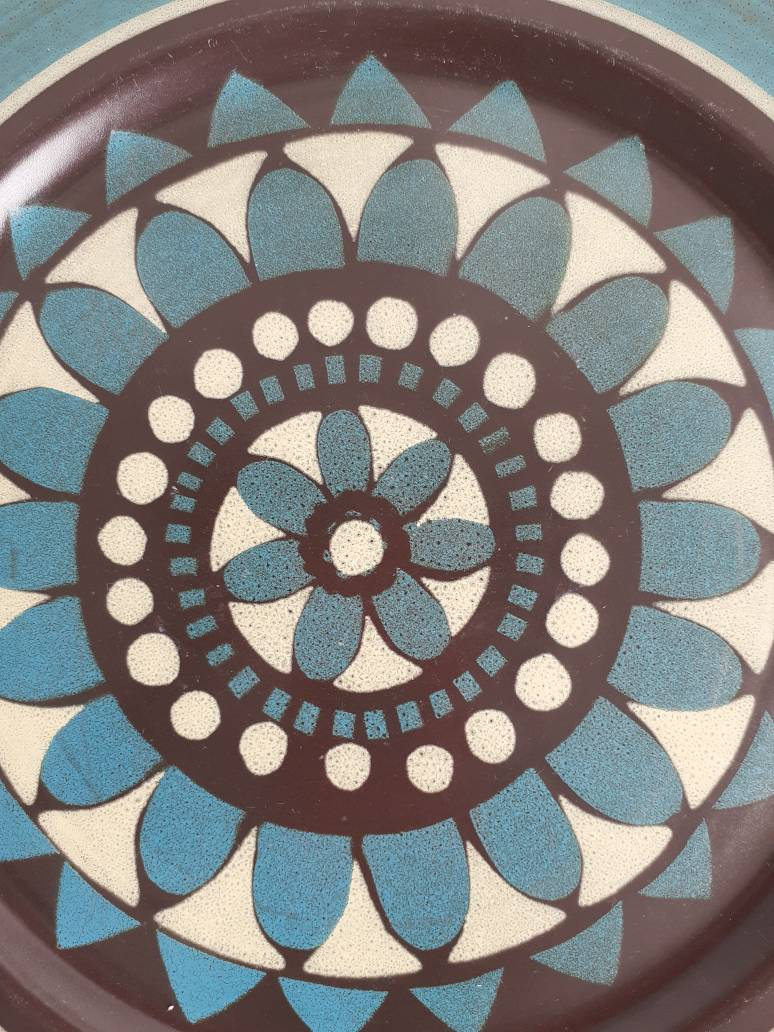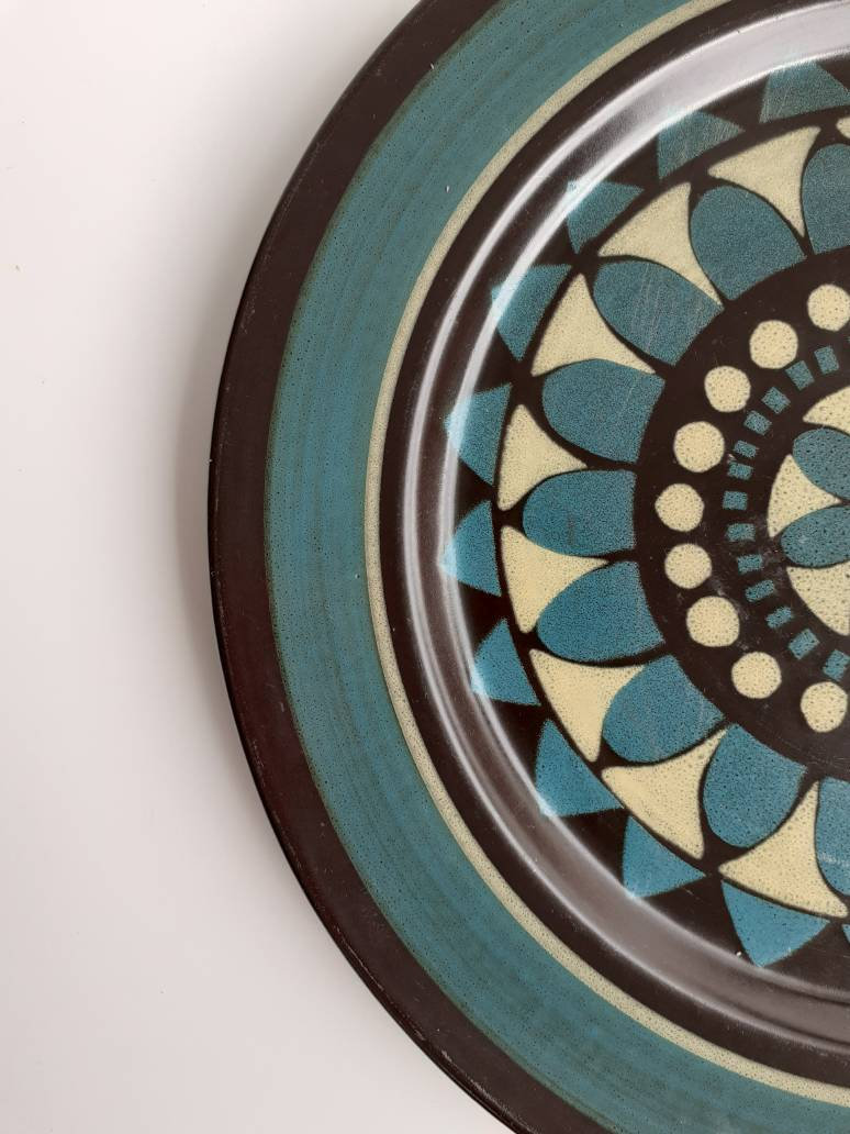 Black, blue, tan and green 12 1/4 "chop plate with geometric design.