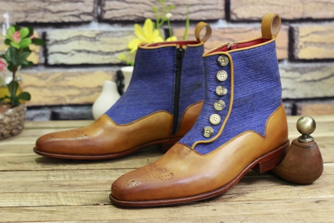 New Handmade Leather Shoes Tan Brown Leather & Blue Denim High Ankle Stylish