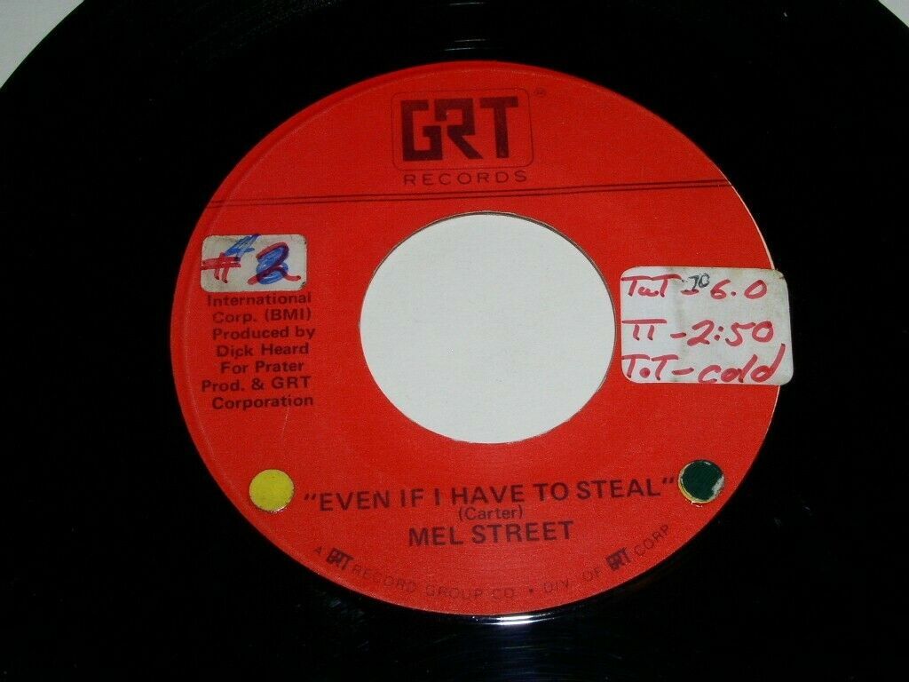 This is the original, vintage 45 rpm phonograph record by Mel Street entitled, "Even If I Have To Steal". Flipside: "Country Pride". Record label GRT 025.