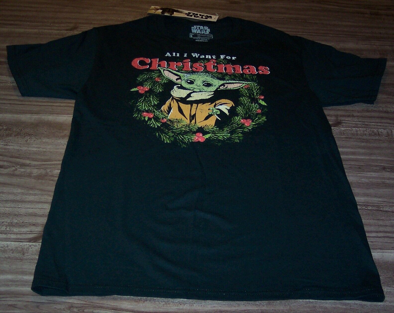 This is a STAR WARS The Mandalorian "ALL I WANT FOR CHRISTMAS" BABY YODA The Child T-shirt. It is a size SMALL, and it is NEW with the tag. It is 18 inches from armpit to armpit and 28 inches in length. The print is made to look vintage. Combine auctions to save on shipping. D3AG