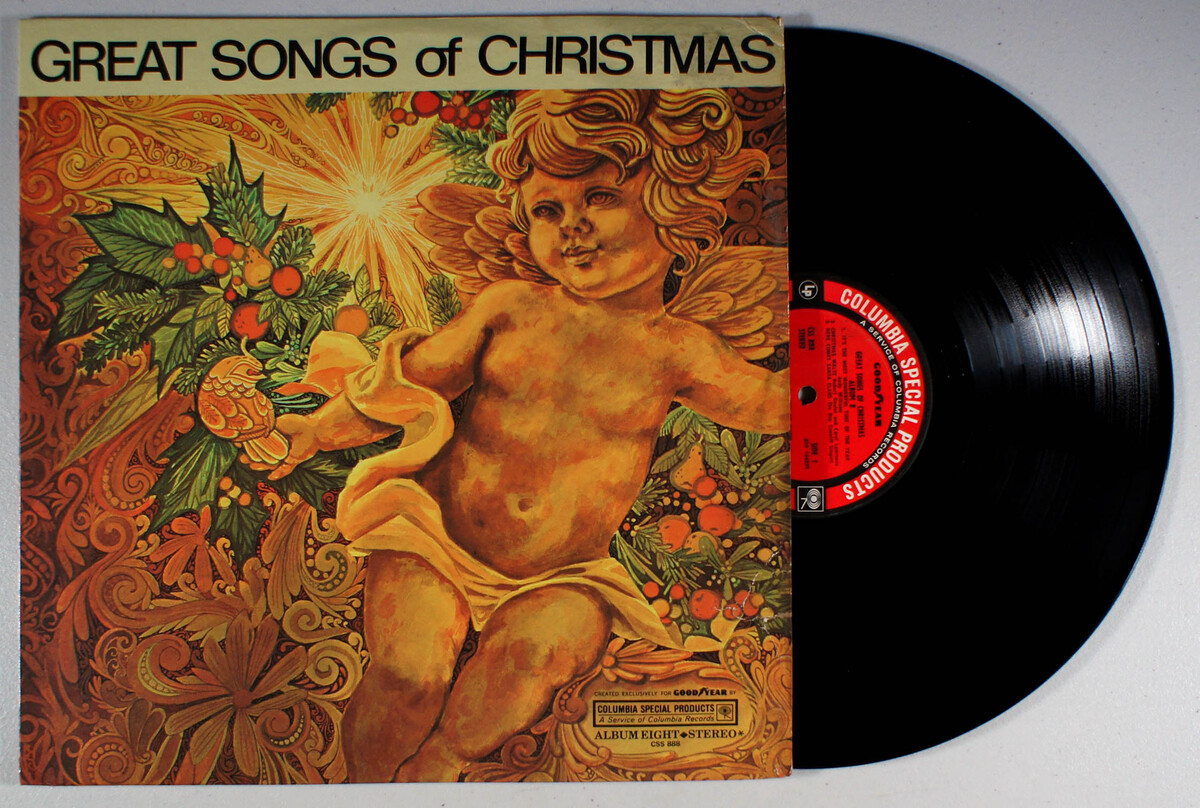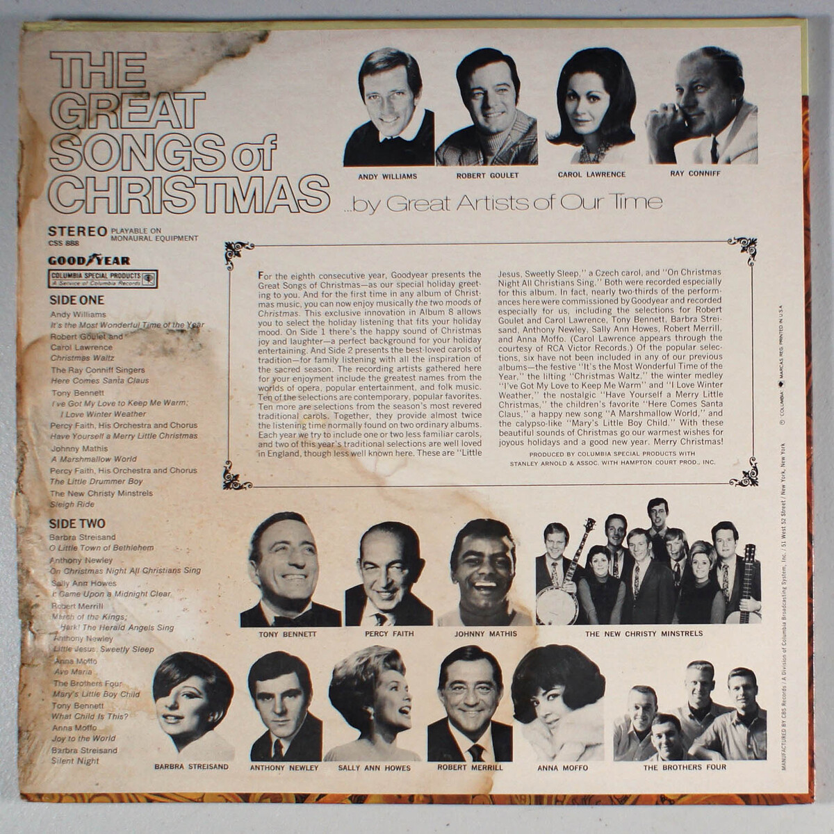 Great Songs of Christmas is created exclusively for Goodyear and contains specially-selected Christmas favorites. "This is the eighth in the Goodyear Series of the Great Songs of Christmas; 18 selections to enrich your holiday. A pleasing blend of the great music of the season, the old and the new...Christmas is a holy time and a happy time. A time to reflect both the reverence and the gaiety of the season. This album which brings you the most of the best, old and new, takes the better part of a year to select talent and material, and to record. At various times, recordings have been made in London, Los Angeles, Paris and New York; the album is truly international. All in all, Great Songs of Christmas is Goodyear's way of wishing you the merriest of Christmases and a rewarding, fulfilling new year. We're proud to be part of your holiday celebration, proud to be included in millions of families' Christmas custom."