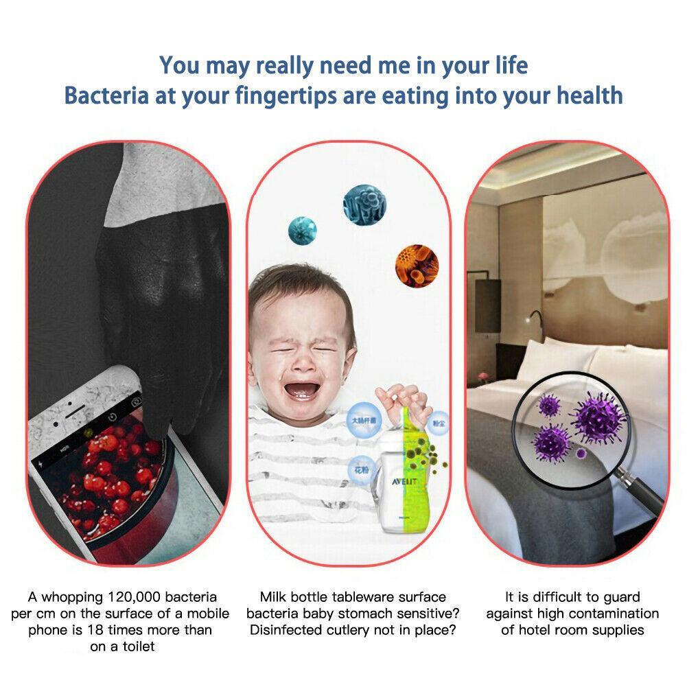 Germs suck. Utilize the cleaning power of nature by using the sunโs UV-rays to quickly sanitize small areas in just seconds. UV-C light targets microorganisms at a cellular level, preventing the spread of illness. Now you can use the same technology trusted for decades by hospitals, laboratories, water sanitation plants to keep you and your loved ones safe and healthy.