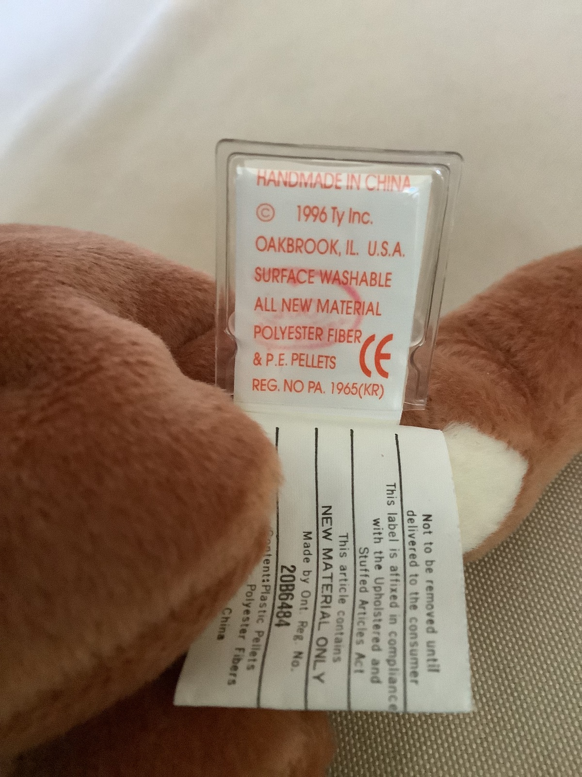 ULTRA RARE Most Valuable Critical Factory Tag / Oddity ( Defective 1996 Pe Pellets Tush tag Should be 1996 P.V.C. Pellets. I.E. Ty Inc. switched from using PVC pellets to PE pellets in Beanie Babies in 1998 This change was made to be more environmentally friendly meaning Original Most Valuable PVC Pellets are inside this Ultra Rare 1996 Pouch ( See Photos # 4 and # 8 above )