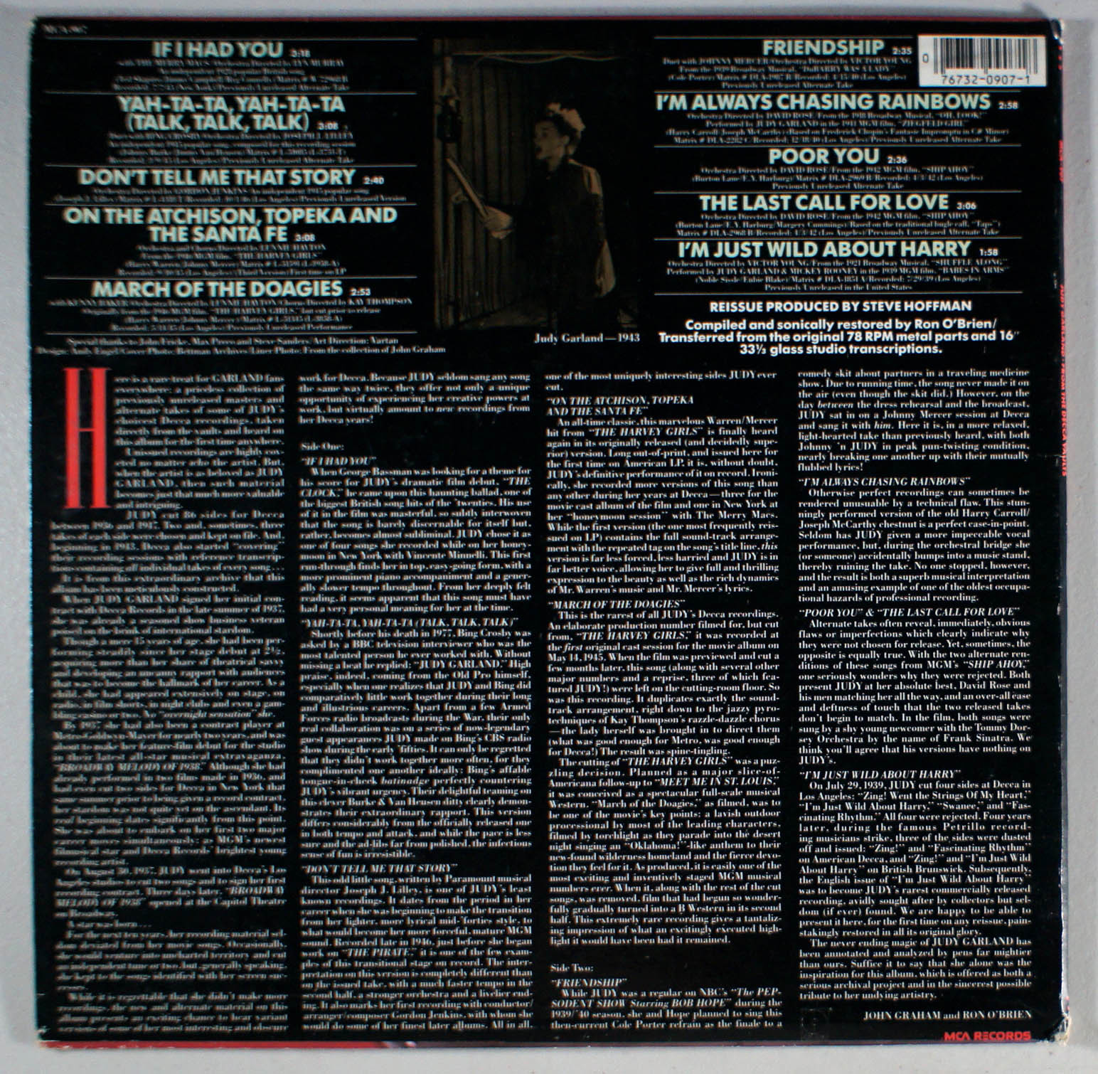 Judy Garland: From the Decca Vaults is a rare treat for Garland fans everywhere: a priceless collection of previously unreleased masters and alternate takes of some of Judy's choicest Decca recordings, taken directly from the vaults and heard on this album for the first time anywhere. While it is regrettable that she didn't make more recordings, the new and alternate material on this album resents an exciting chance to hear variant versions of some of her most interesting and obscure work for Decca. Because Judy seldom sang any song the same way twice, they offer not only a unique opportunity of experiencing her creative powers at work, but virtually amount to new recording from her Decca years. (liner notes)