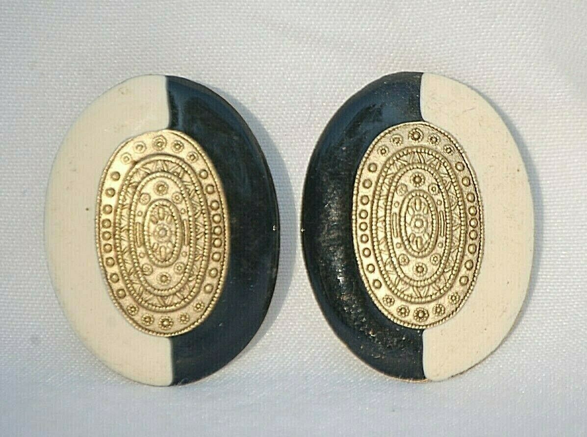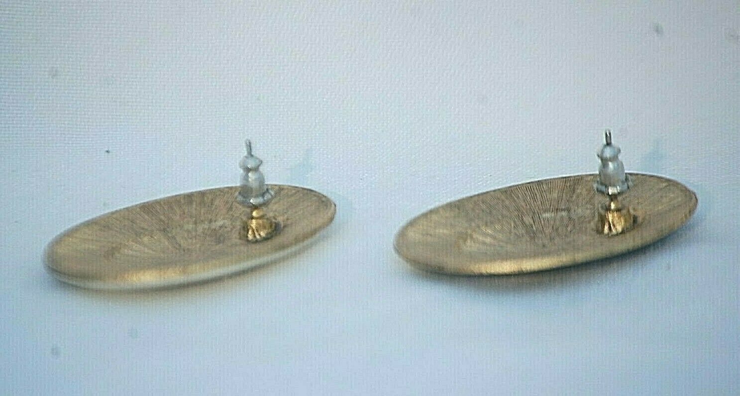 Designer Inspired Oval Two Tone Pierced Earrings w Gold Tone Medallion Center c