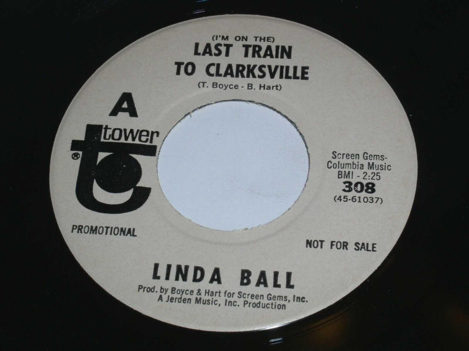 This is a vintage promotional 45 rpm phonograph record by Linda Ball, entitled, "Last Train To Clarksville". Flipside: "I Wanna Be Free". Record label: Tower 308. Comes with the original Boyce Hart Producer Of The Monkees. Tower Records paper sleeve as shown.