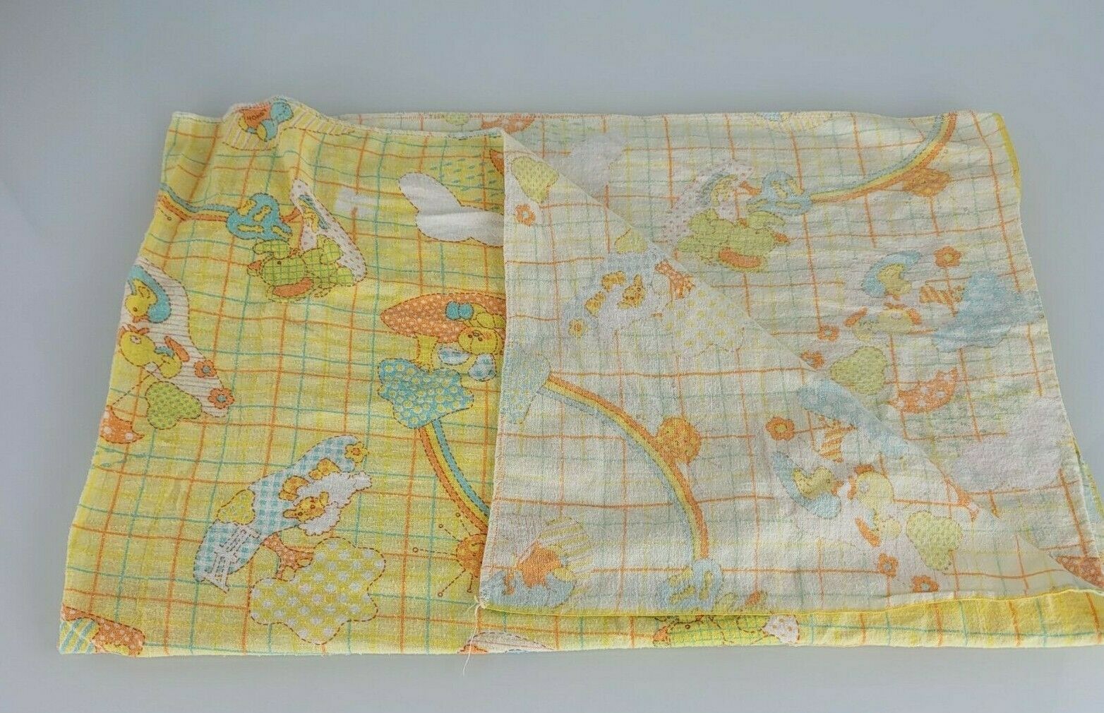 Vintage Baby Flannel Blanket Yellow Orange Blue Duck Umbrella Rain Cloud Bunny