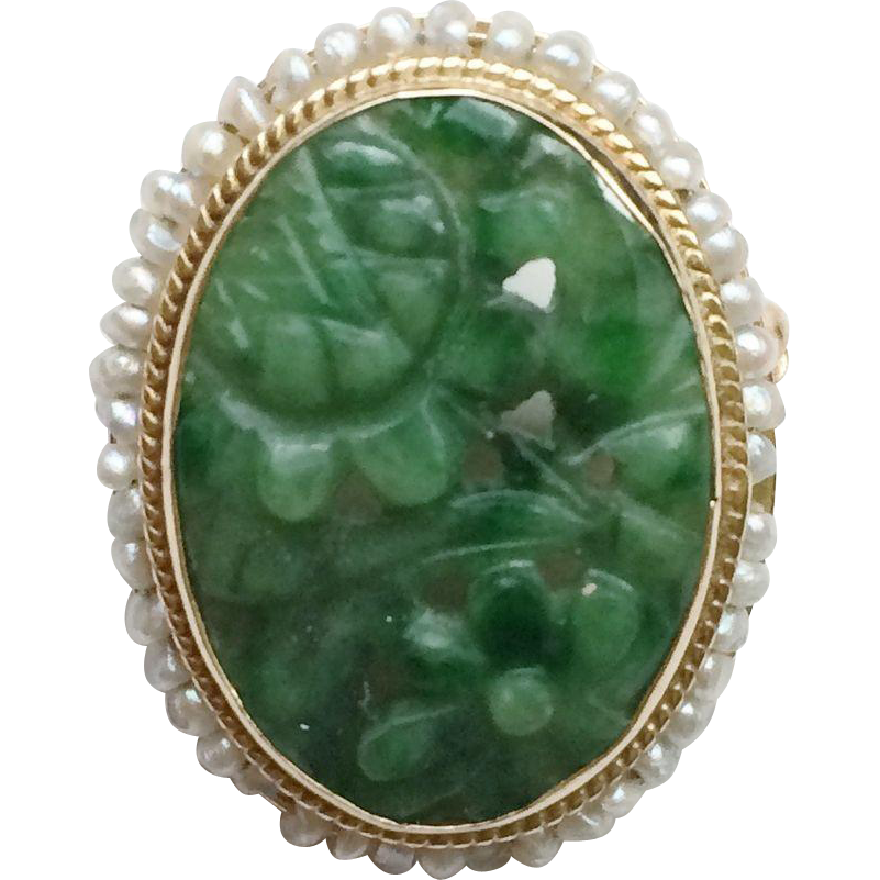 Exquisitely Carved Jade Brooch in 14k Gold with Seed Pearls, Art Deco