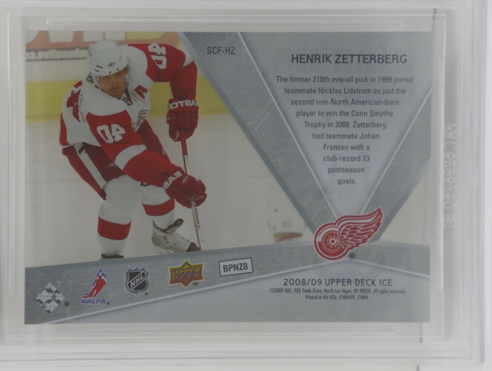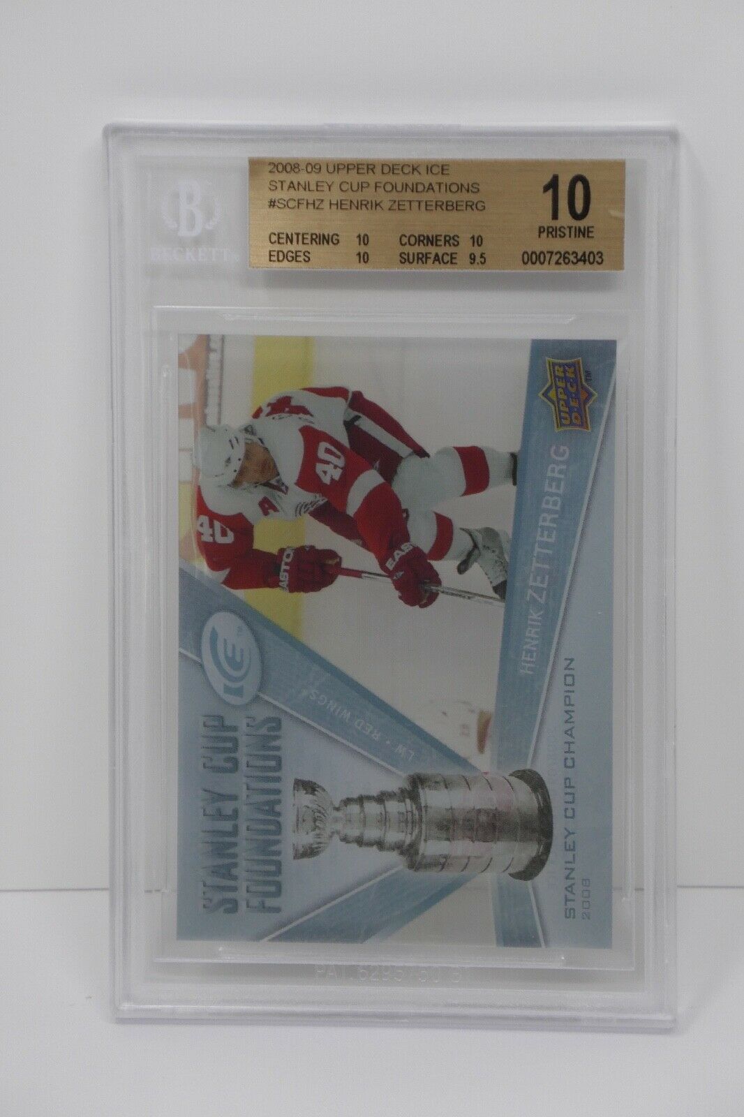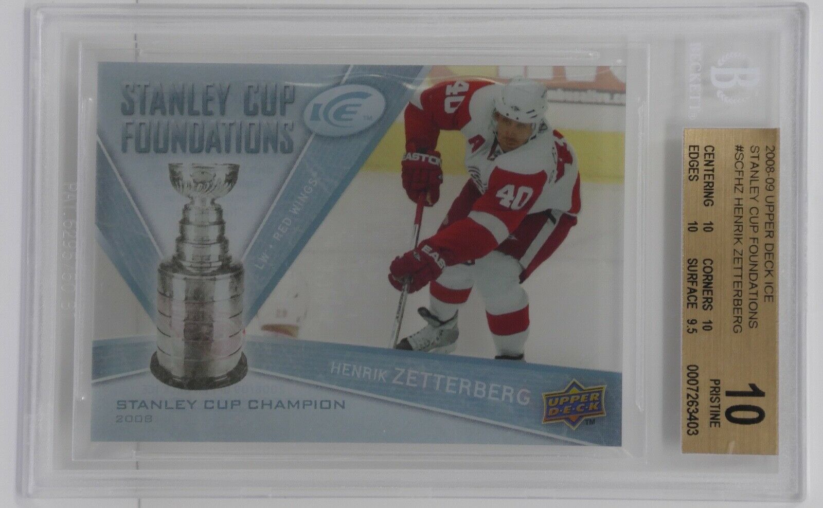 Up for sale is a 2008-09 Upper Deck Ice Stanley Cup Foundations Henrik Zetterberg Card. This has been graded by Beckett.
