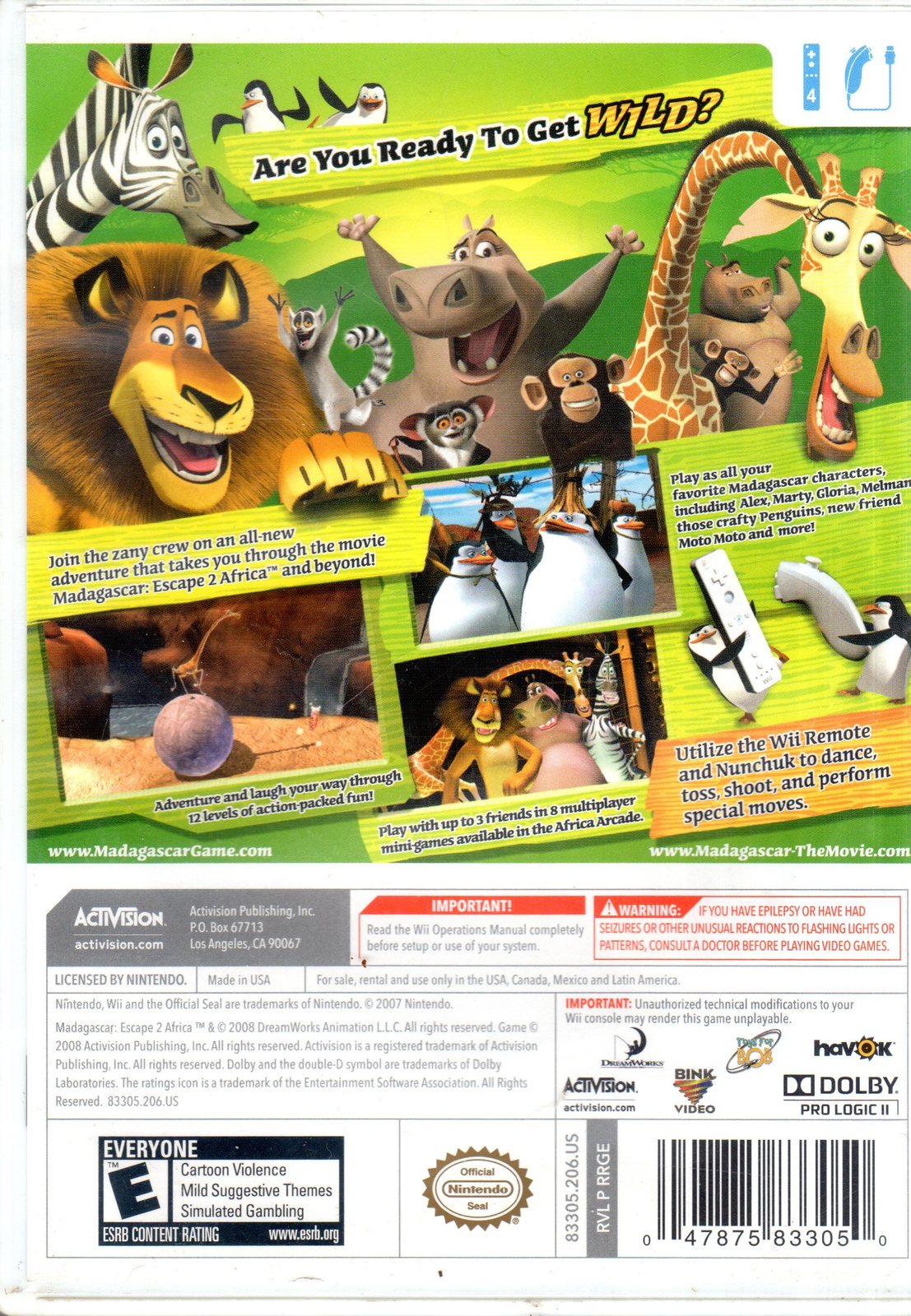 Madagascar 2 : Escape Africa Wii Game. Switch between all the main characters to take advantage of their unique skills. Join friends and play through a host of mini-games.Run and jump through locations based on the motion picture.