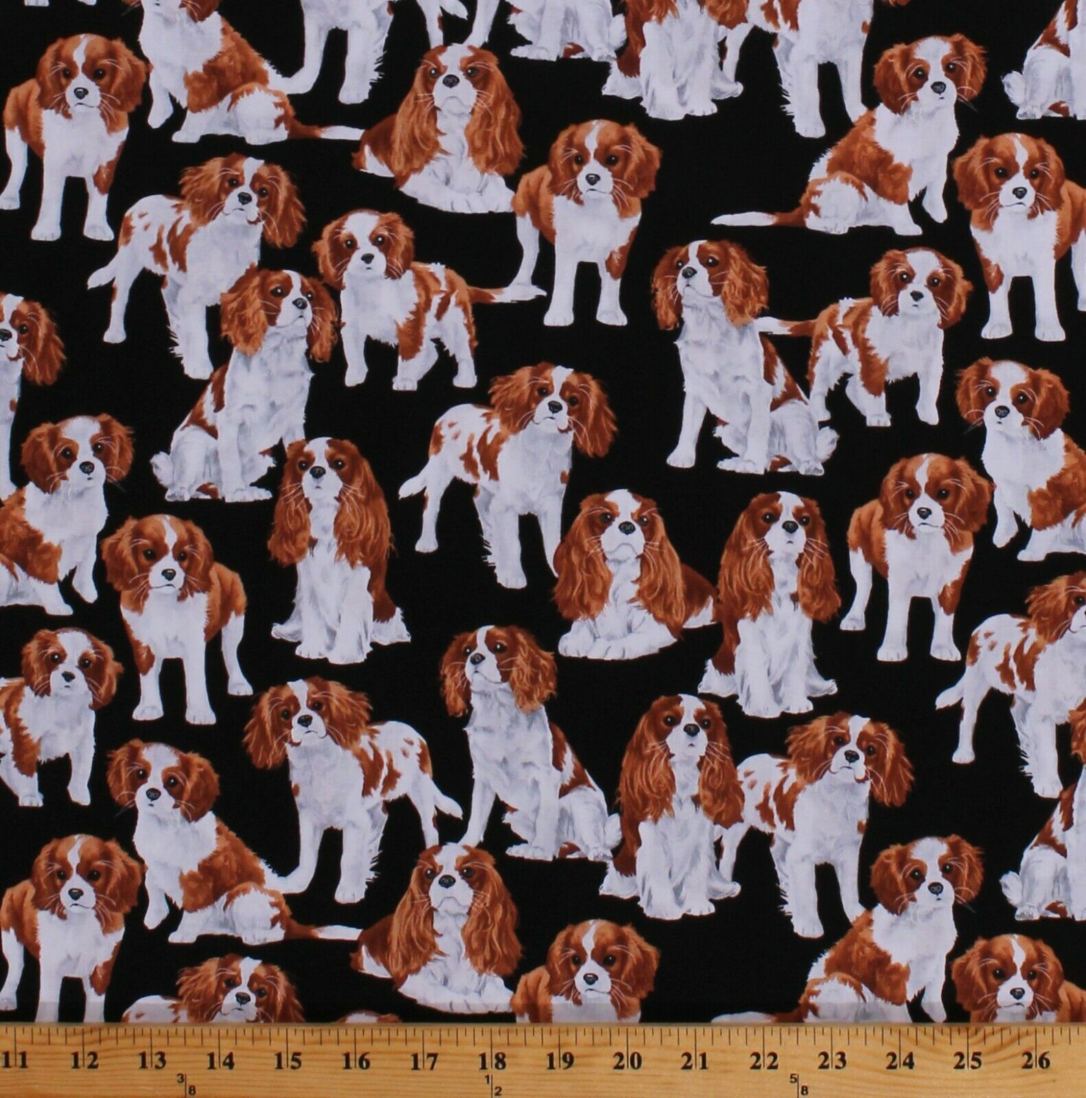 Cotton Dogs Puppies Cavalier King Charles Cocker Spaniel Animals Pets Canine Cotton Fabric Print by the Yard (GM-C7366-BLACK)