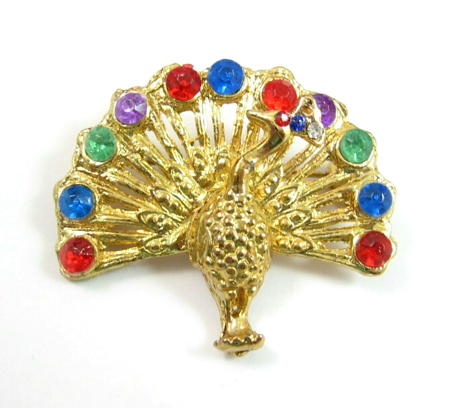 Pretty as a PEACOCK PIN Vintage Brooch RHINESTONES Goldtone WONKY Bird Peafowl
