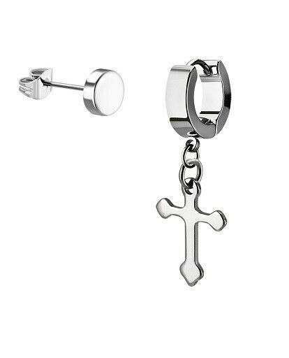 Budded Cross Helix Huggie Hoop and Plug Stud Silver Tone Stainless Steel Earring
