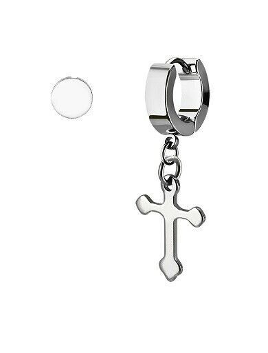 Looking for trendy styles of the moment dangling motifs earrings? This new sexy style motif is the one! And not only that! Lucky for you, iJewelry2 adds a magnificent illusion tunnel plug stud matching with the dangling huggie hoop color tone so you can put them both at the same time or use it separately. These two ear accessories will give you a cool and sexy look wherever you go out with them. Both of them are made of high-quality and durable silver-tone surgical stainless steel; the helix huggie hoop measures 10 mm in diameter, 3 mm thick with a 15 mm budded cross dangling motif and the illusion tunnel plug stud measures 5 mm in diameter. Best price in the market; for pierced parts only, different styles and colors are available.