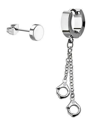 Handcuffs Chain Huggie Hoop and Plug Stud Silver Tone Stainless Steel earrings