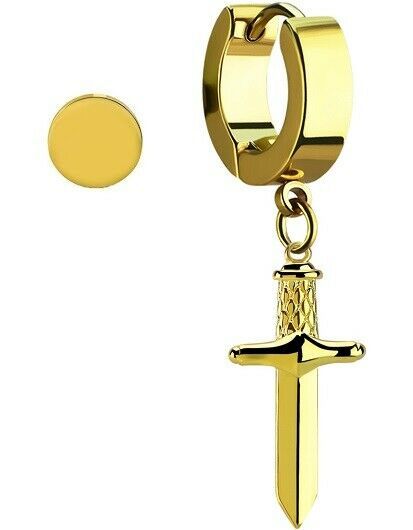 Sword Dagger Huggie Hoop and Plug Stud Gold Tone Stainless Steel Earrings