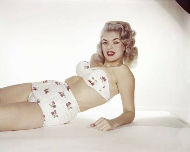 Jayne Mansfield 1950's pin-up pose in white bikini smiling 8x10 photo