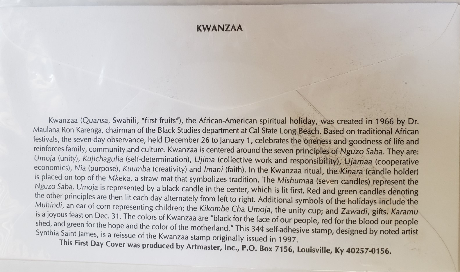 First Day Issue for KWANZAA. Oct 21 2001. New York NY. 4 Kwanzaa USA 34 cent stamps. Backside has short history of the African-American spiritual holiday. Artmaster.
