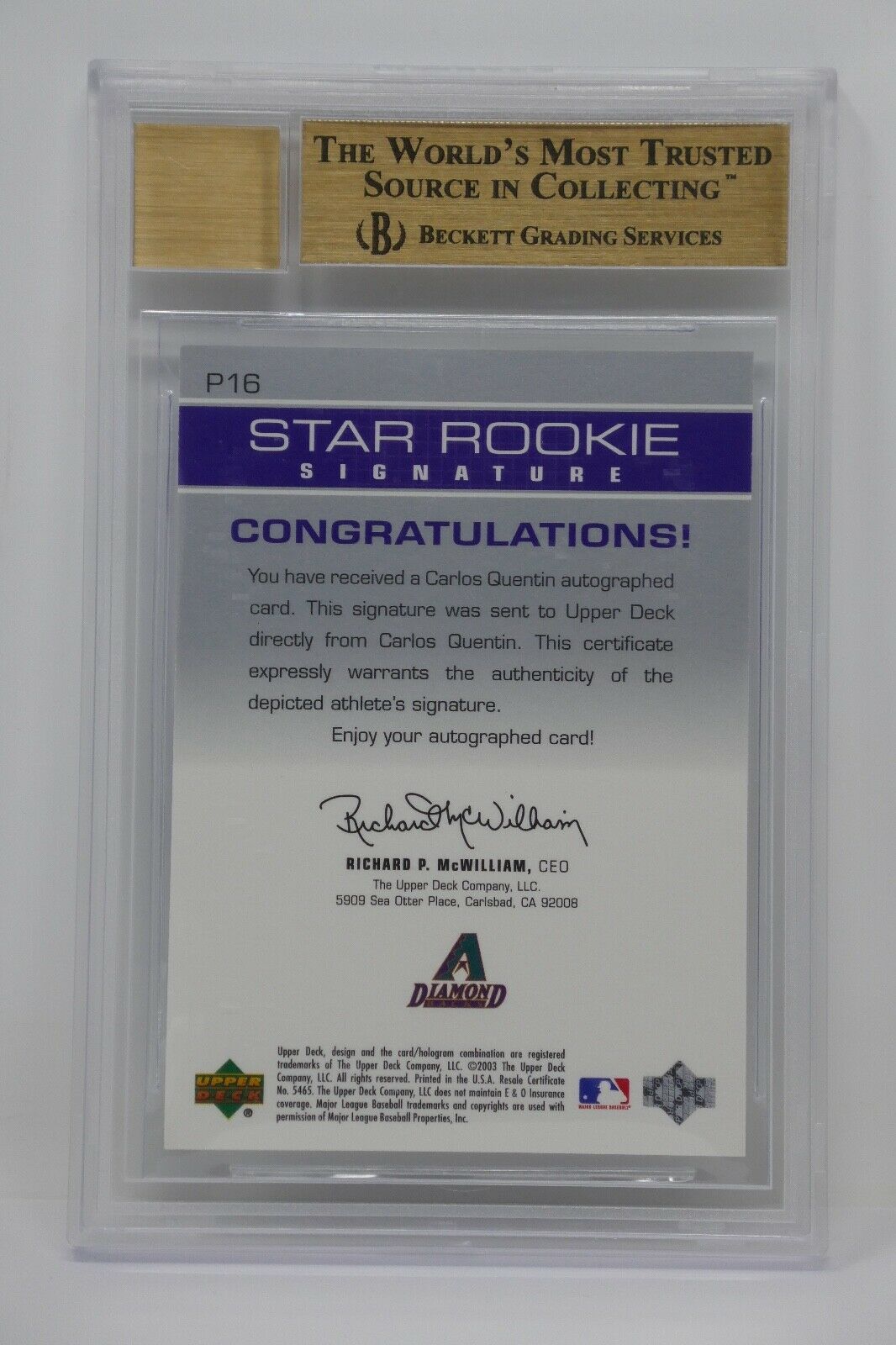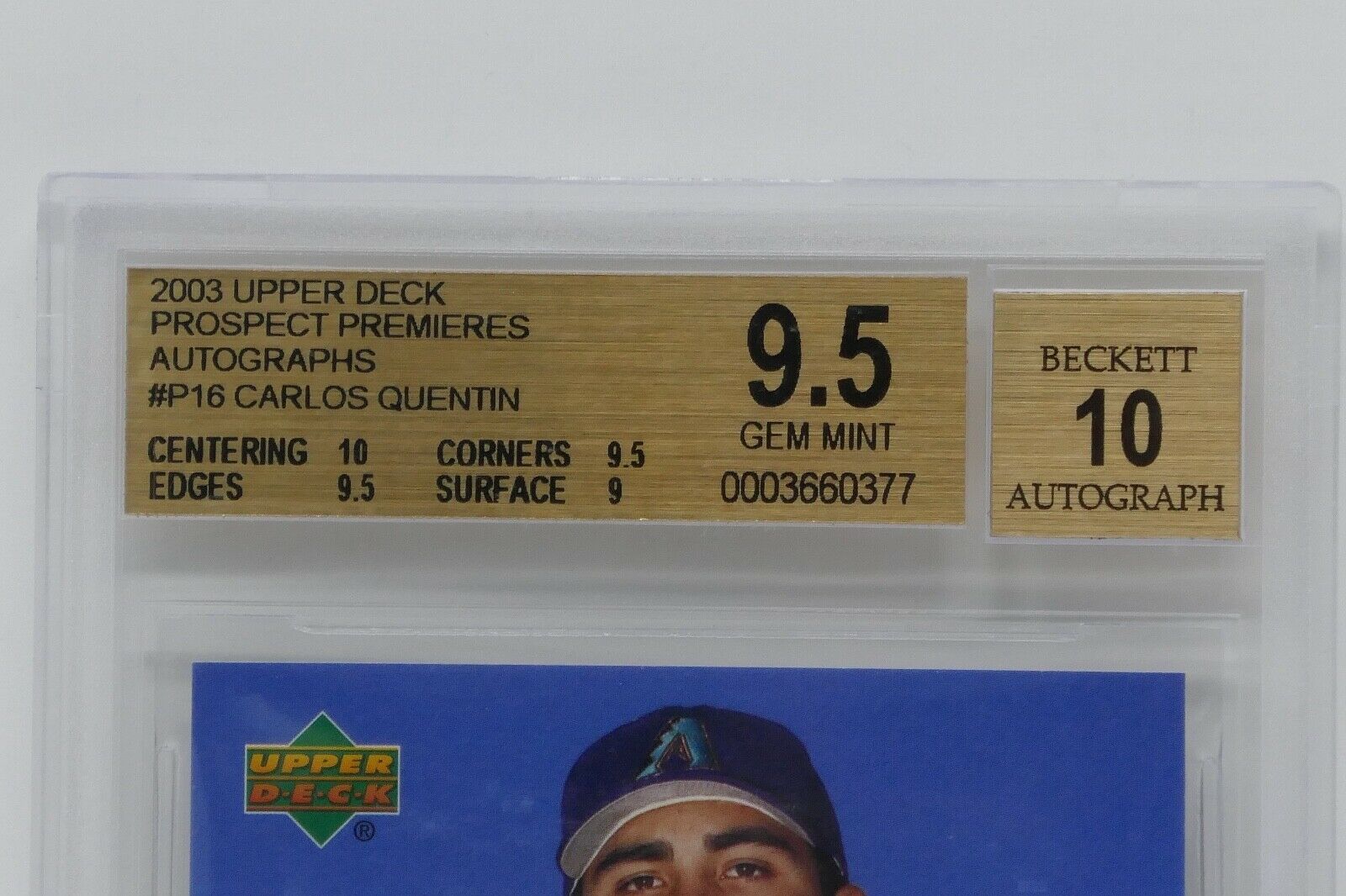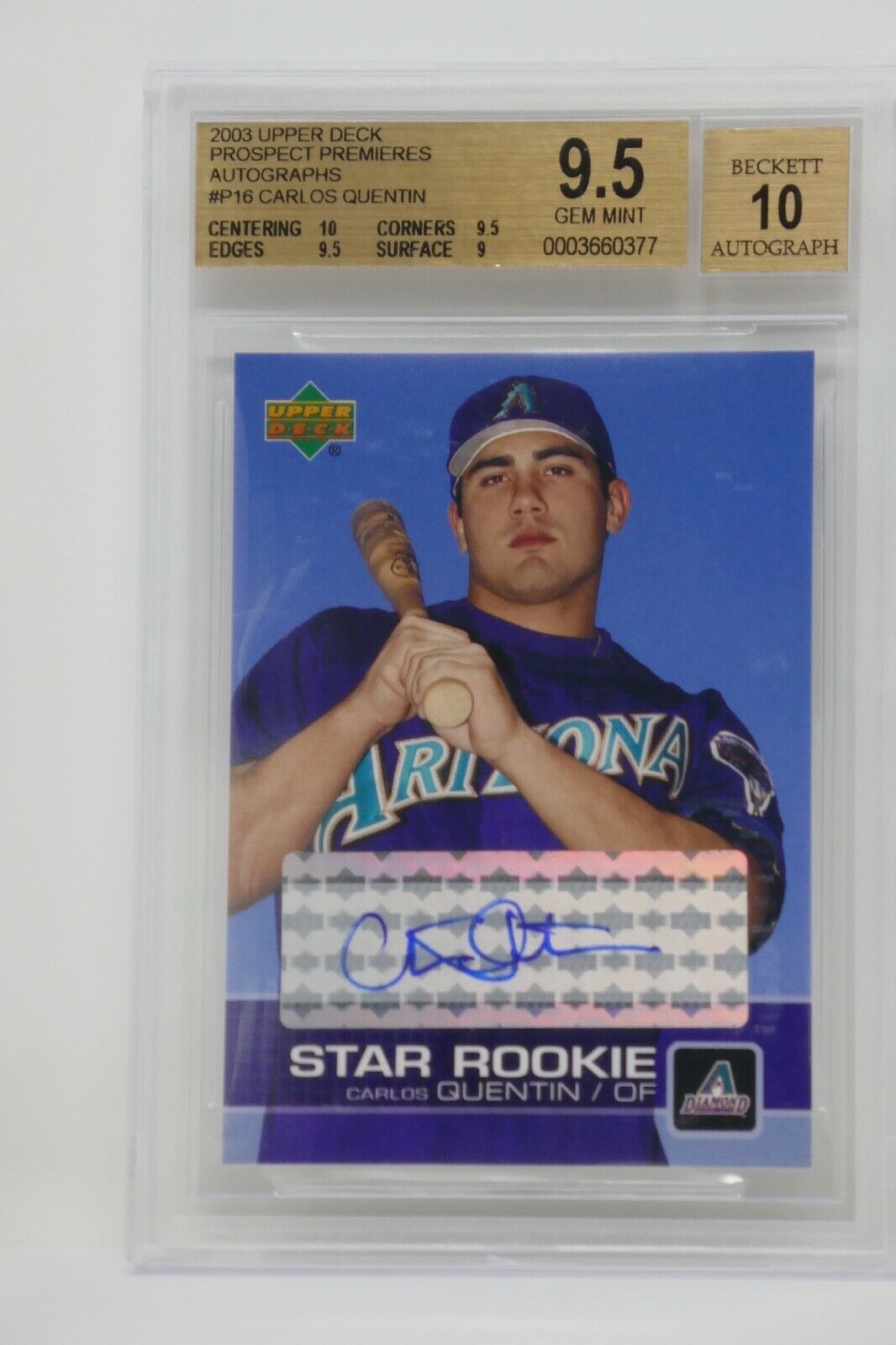 2003 Upper Deck Prospect Premieres Autographs Carlos Quentin RC Beckett 9.5