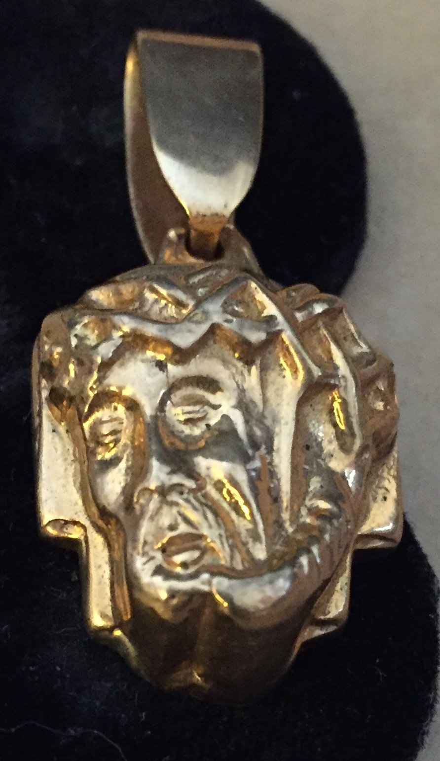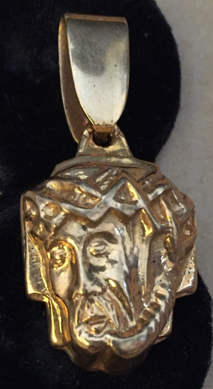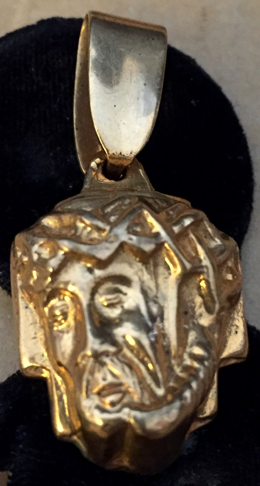 This is a Hard-To-Find, VINTAGE, EXCELLENT Condition, Marked "Italian 14K Yellow Gold Plated 3 Three Dimensional Jesus Christ Our Lord Head Face Unisex Pendant" purchased in Italy in the mid-1970s. My neighbor purchased this DELIGHTFUL Pendant while visiting Italy in 1975 and has worn it on a heavy Gold chain over the years. Getting ready to move to a nursing home, he MUST sell what he can't take with him. His LOSS can be your GAIN. It is in EXCELLENT Condition with NO Damage and comes from a smoke-free, pet-free home. With a drop of approximately 1 1/2 inches, including the bale, the Head itself measures approximately 1 1/8th inches tall and approximately 3/4ths of an inch wide; the back is Marked "14K".