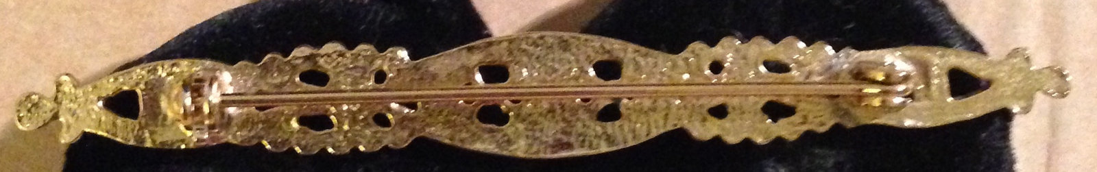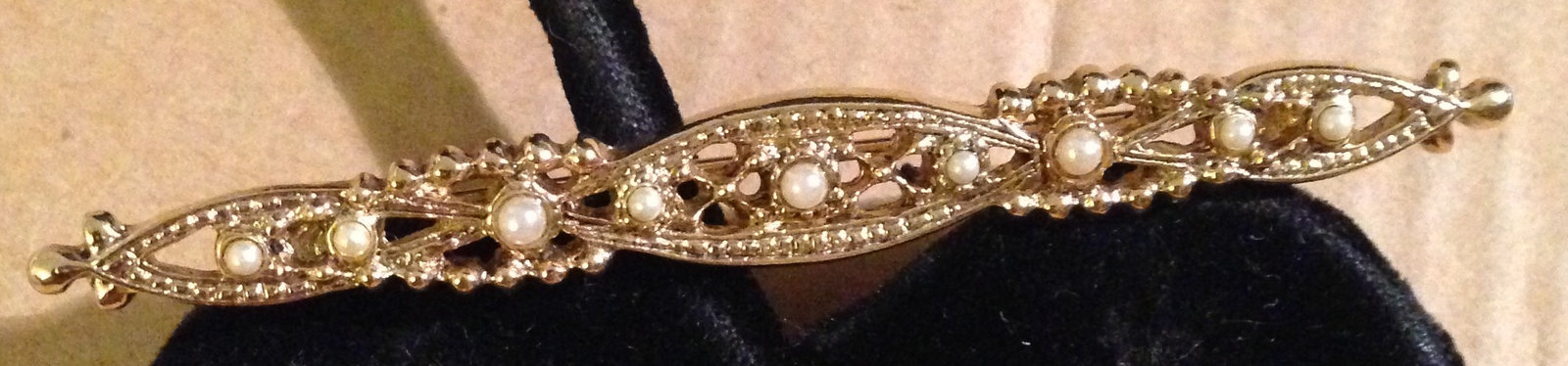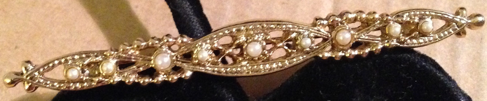 This is a VINTAGE, EXCELLENT Condition "Shiny Gold Tone Filigree Faux Pearls Collar Bar Pin Brooch" from the early-1970s. My neighbor purchased this BEAUTIFUL Victorian-Style Pin in 1973 and has worn it occasionally over the past 45+ years. It is in EXCELLENT Condition with NO marks, stains, odors, wear, missing Pearls or other damage; it comes from a smoke-free, pet-free home. With a length of approximately 2 1/2 inches, it measures approximately 1/4th of an inch wide with the swivel pinback measuring approximately 1 3/4th inches long, working smoothly and holding securely; this LOVELY Pin is NOT Marked.