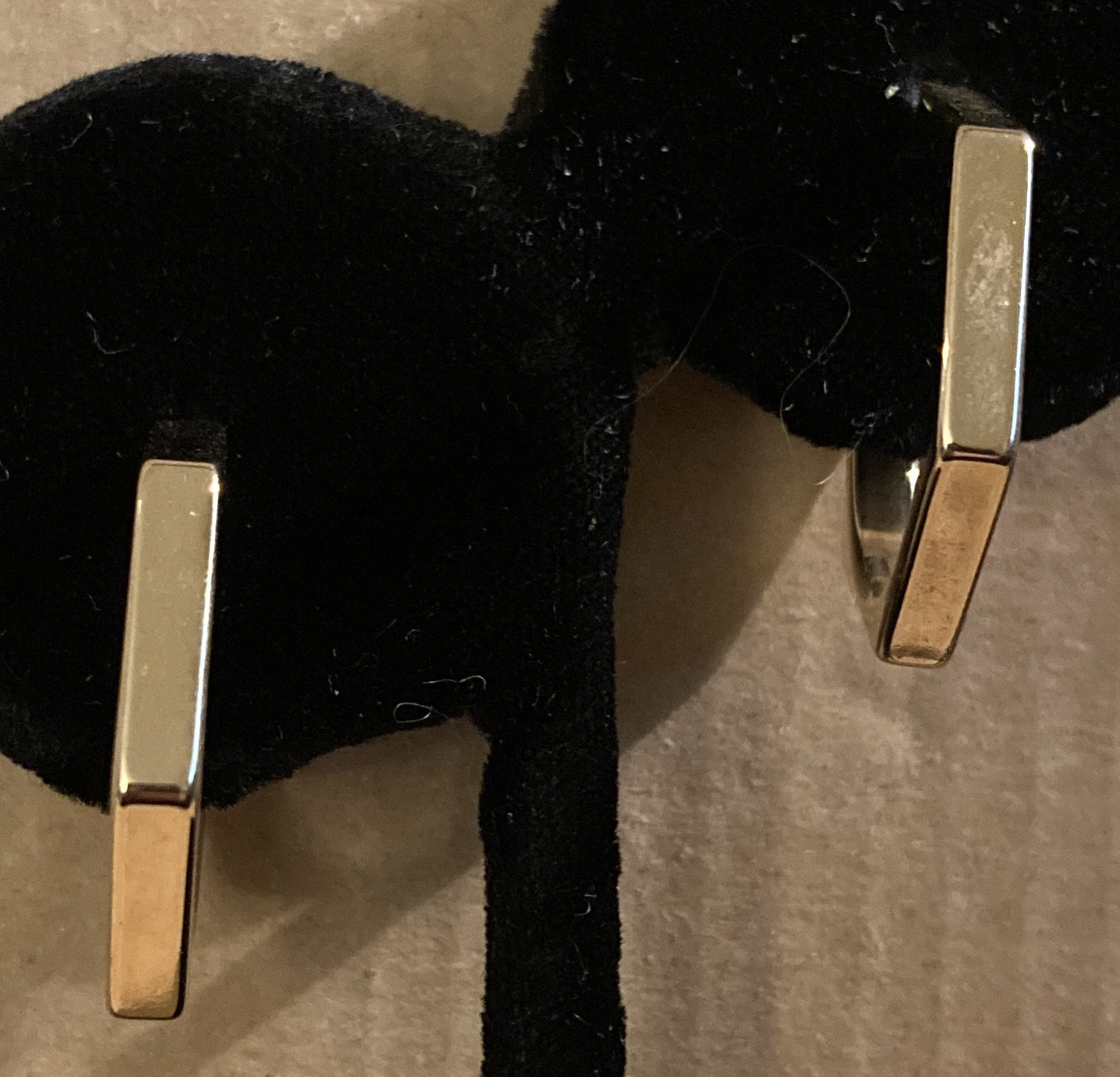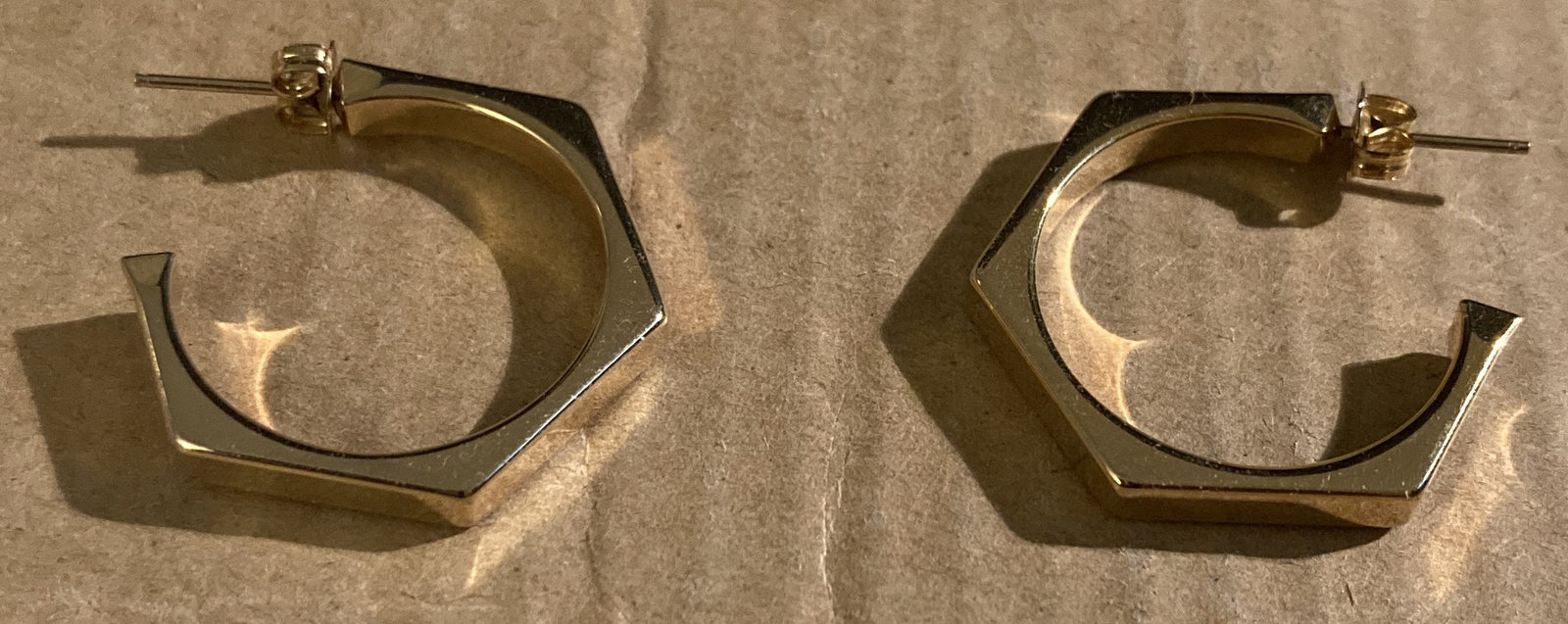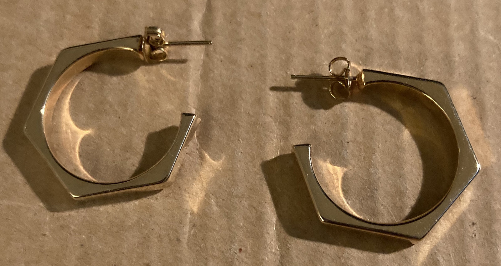 This is a pair of VINTAGE, MINT Condition โGold Plated Five 5 Sided Square Edge Hoop Post Back Pierced Ear Earrings" from the mid-1970s. My friend purchased these LOVELY Hoop Earrings in 1975 and has worn them occasionally over the past 45 years. Getting ready to move to a smaller home, she MUST downsize her EXTENSIVE Jewelry collection. Her LOSS can be your GAIN. With a diameter of approximately 1 inch, they measure approximately 1/8th of an inch wide/thick; they are NOT Marked.