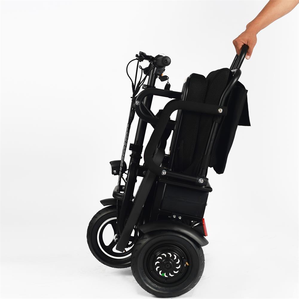 Introducing the new Folding Mobility Scooter by MotoTec. Its compact, three wheel styling makes for a sharp turning radius, 2 hub motors built into the rear wheels provide amazing torque for riding up inclines with its light weight durable frame made from Aluminum. The lithium battery is light weight and lasts longer than your standard lead acid competing models. Comes standard with headlight, rear reflectors, key start, reverse, dual rear drum brakes, comfortable seat with backrest, carrying bag and large 10 inch air filled tires to provide a comfortable ride.