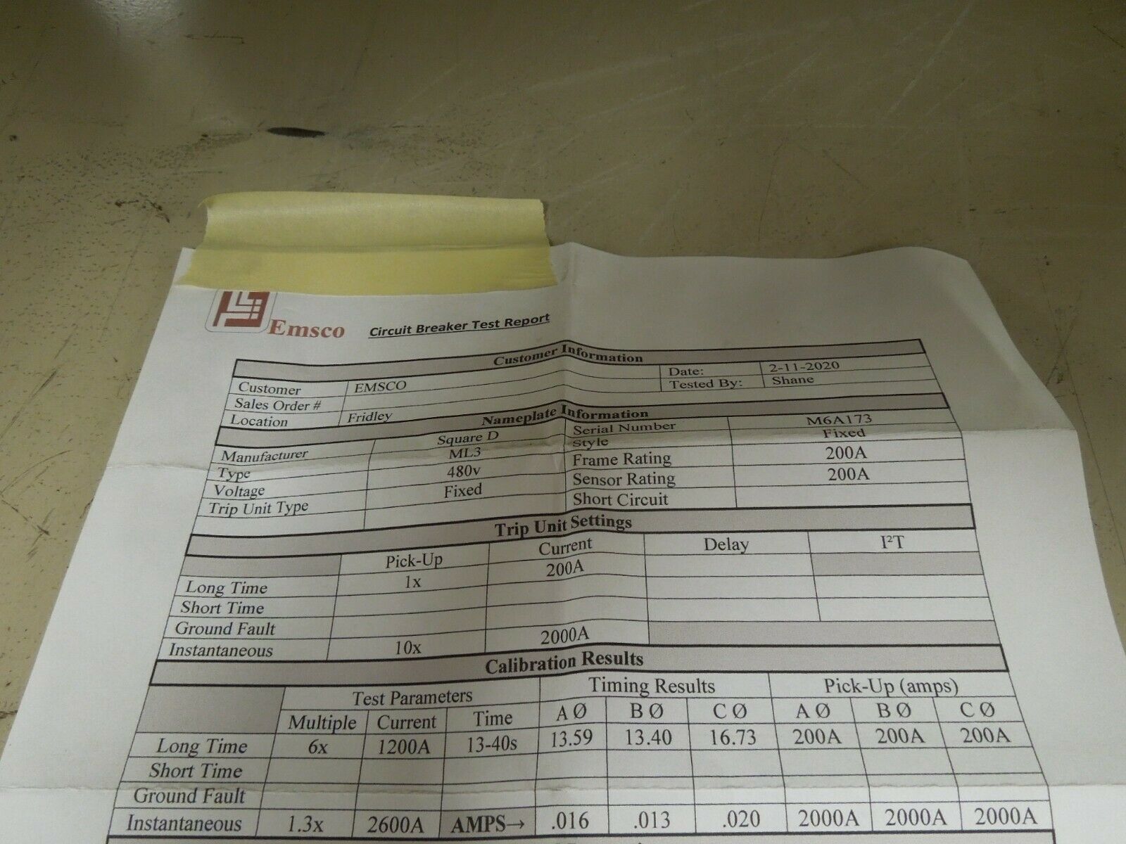 Square D Type ML-3 997326 200A 3p 600V AC Circuit Breaker Used- With Test Report