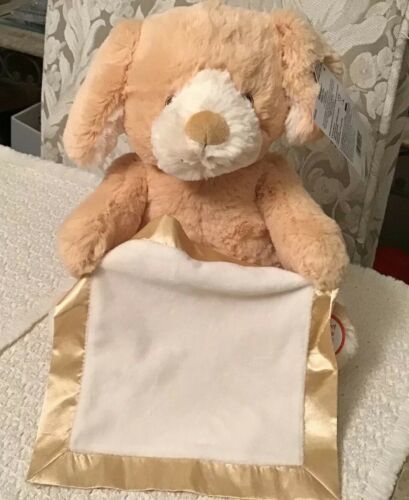 Gender-neutral tan Peek-A-Boo puppy features safe, soft embroidered eyes and movable arms holding a matching, satin-accented blanket that provides additional tactile play sensation