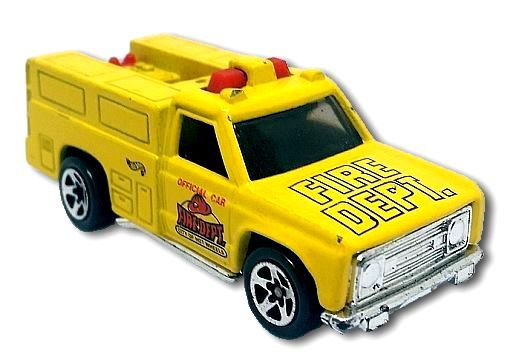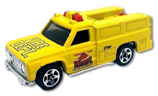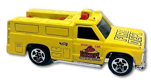 Description: Yellow w/Red interior; Smoke window; Red Black ‘Official Car,’ ‘Fire Dept.,’ ‘City of Hot Wheels’ on doors; Black ‘Hot Wheels’ logo on sides of box; ‘Fire Dept.’ on hood; Chrome Malaysia base w/Chr5SP’s. 010221-010221P-L05