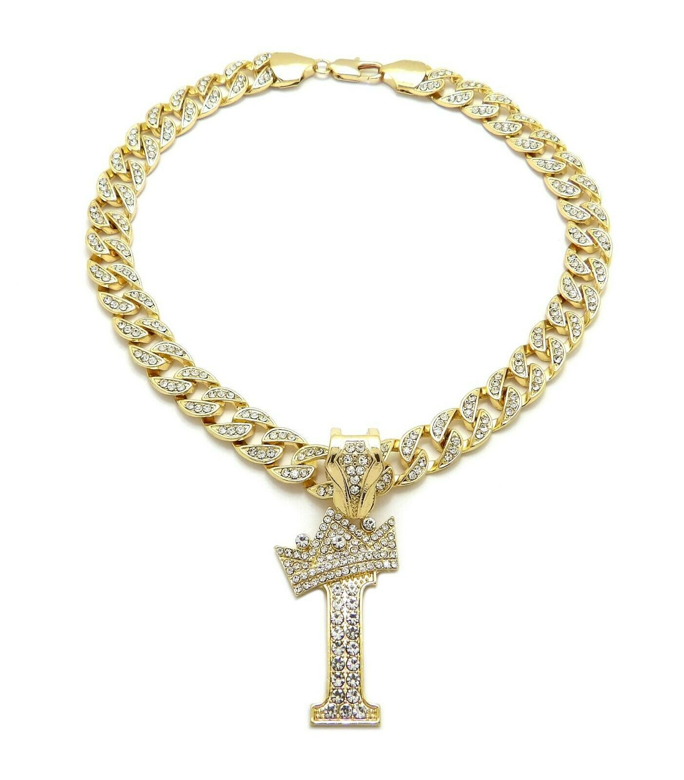 Crowned Initial Letter I Crystals Pendant Gold-Tone Cuban Linked Chain Necklace