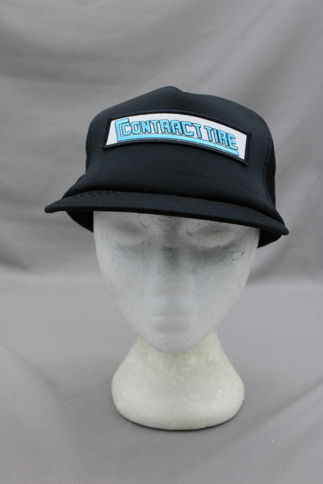 Up for sale is a vintage patched trucker hat. The hat has a black base colour and the front of the hat has Contract Tire stitched into the patched. The contract tire wording is done in a neon blue which makes it stand out on the black base colour of the hat. What an amazing vintage hat do not miss out on it.
