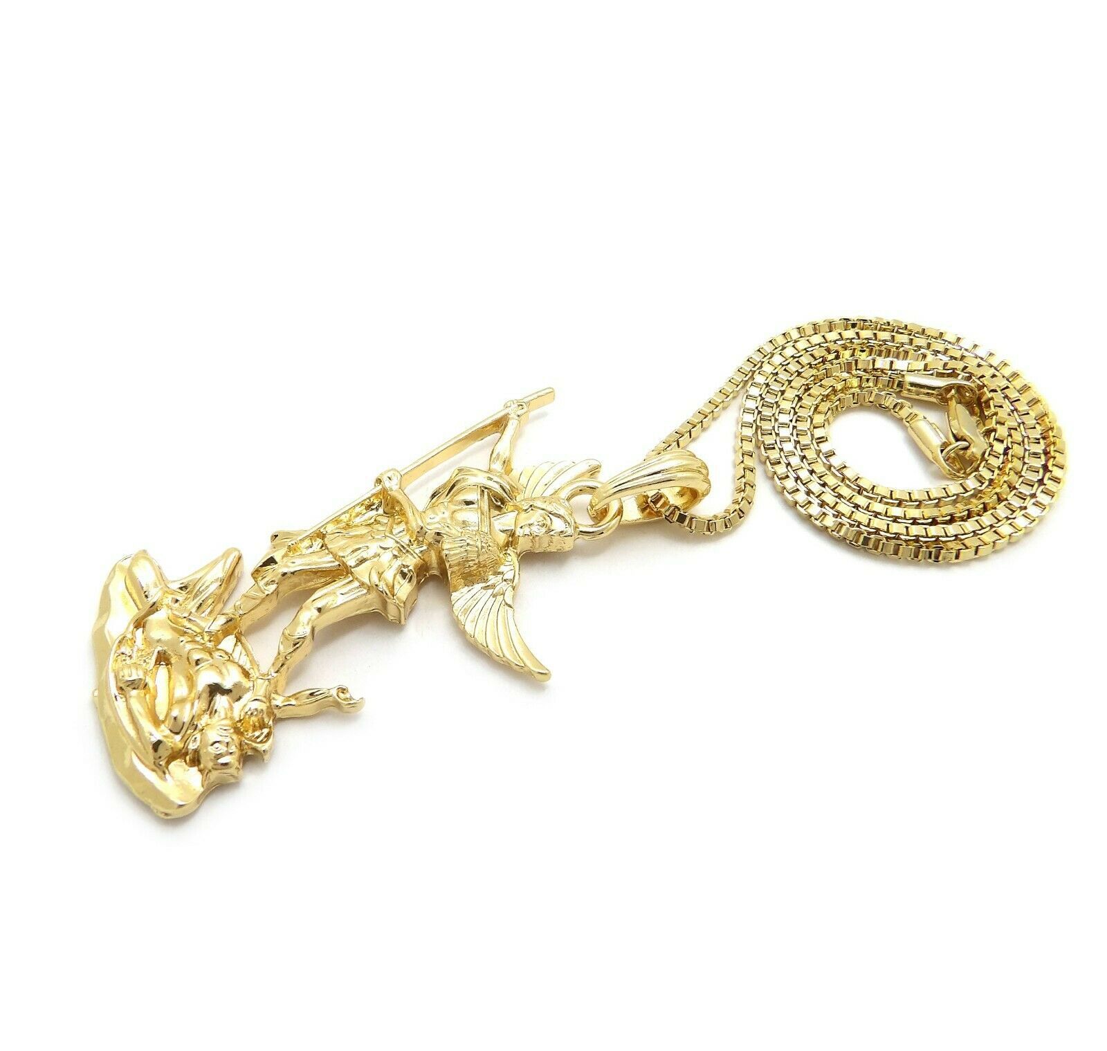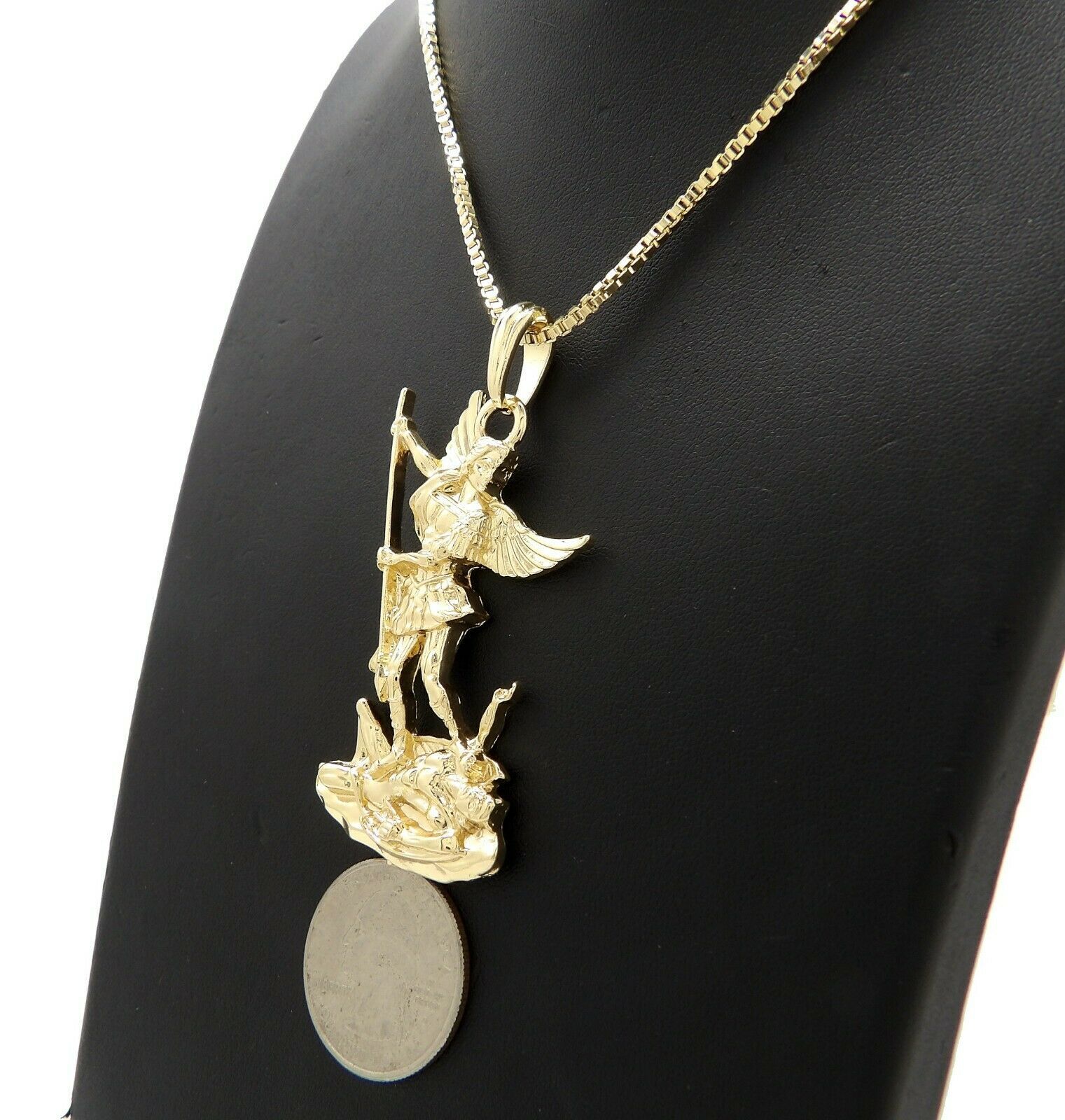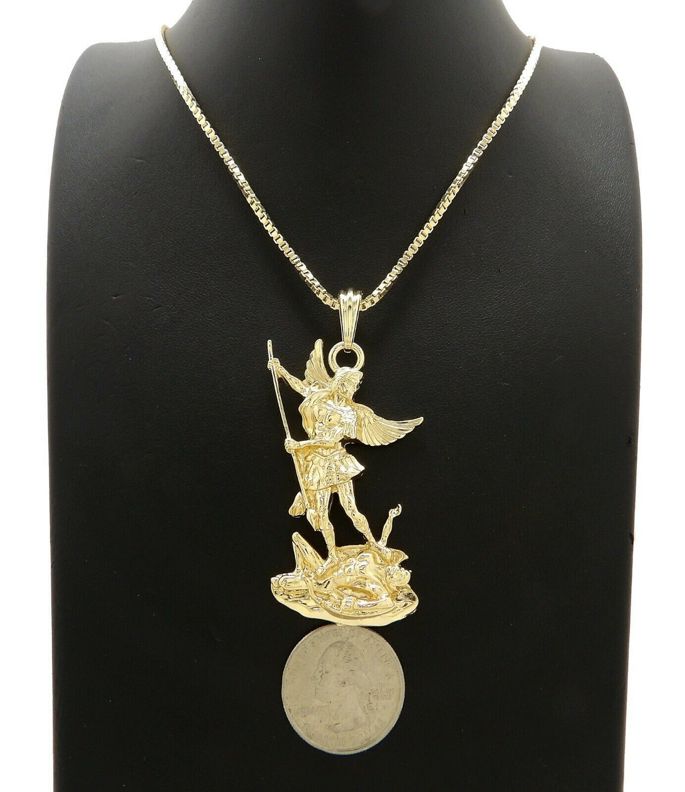 iJewelry2 always will focus on introducing you to a stylish lifestyle; this time will be with a spectacular urban necklace style. This gold-tone brass necklace chain features a well designed Saint Michael the Archangel pendant. The Saint Michael pendant measures 1.25'' x 2.5'' with a 2 mm box chain that will look fine with your urban daily outfit. The details of this pendant are incredibly well designed, showing a clearness figure of Saint Michael the Arcangel. You can choose between different chain lengths 16'', 18'', 20'' or 24''.