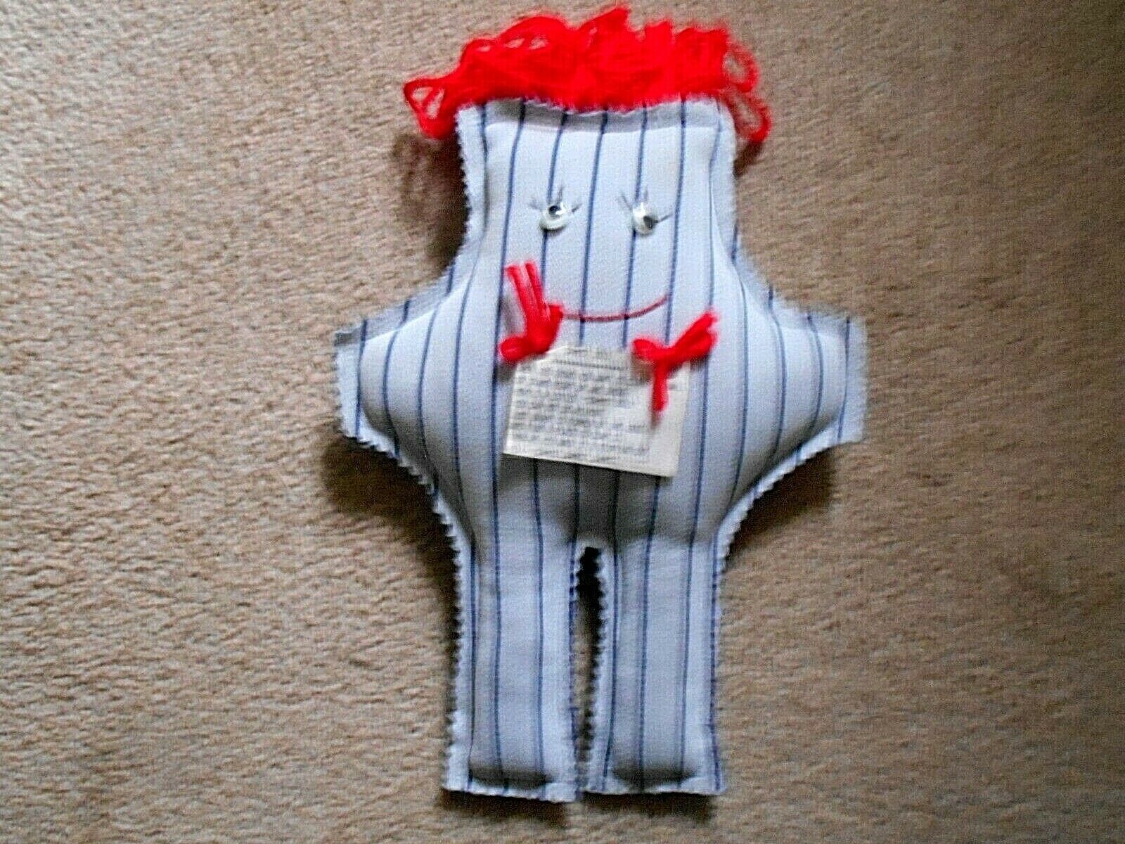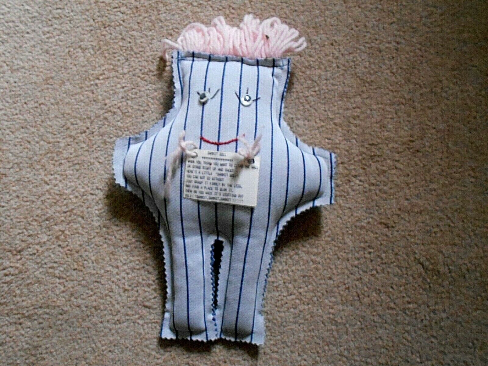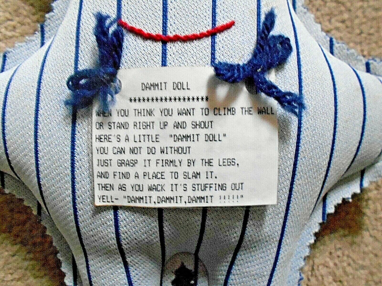 * The tag on the doll reads: When you want to climb a wall or stand right up and shout - Here is a "Dammit Doll" you can not do without, just grab it by the legs and slam it and as you wack its stuffing out yell Dammit, Dammit.
