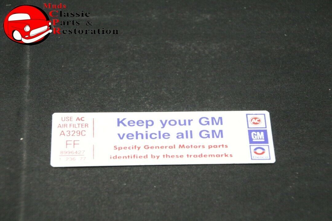 1977 Camaro V6 Air Cleaner "Keep Your GM Car All GM" Code "FF" Decal (New)