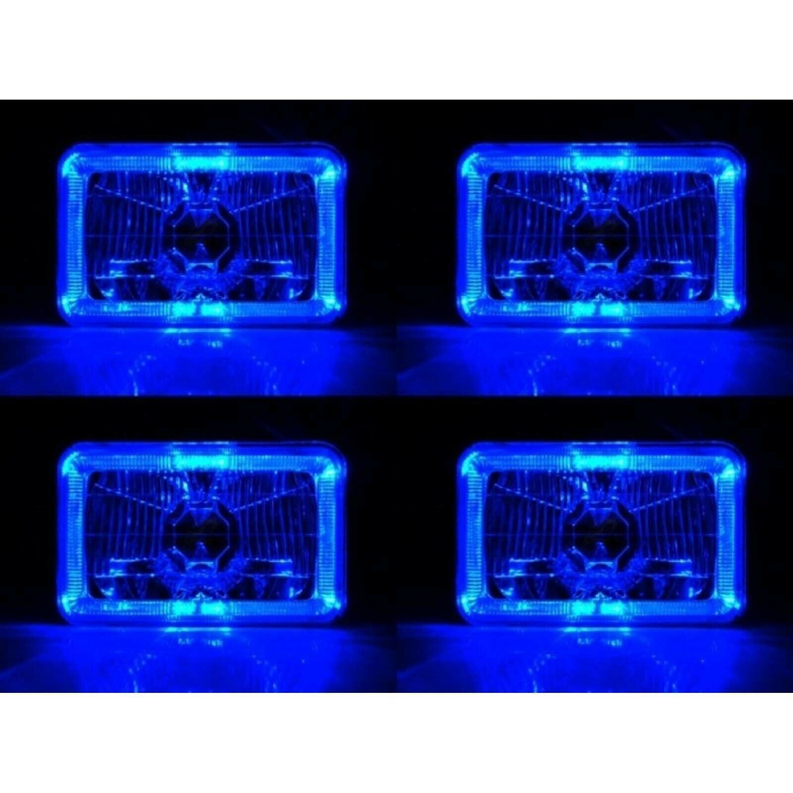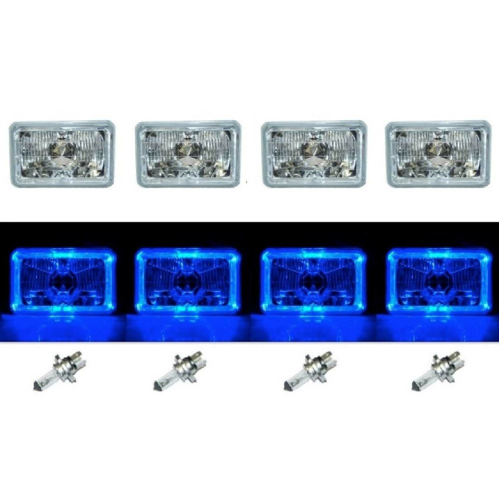 THIS LISTING IS FOR A SET OF 4 NEW 4" x 6" CRYSTAL CLEAR HALOGEN BLUE HALO HEADLIGHT BULBS. THIS SET INCLUDES 2 HIGH BEAM 2 HIGH / LOW BEAM HEADLIGHTS WITH CLEAR BULBS 60W/55W. THESE HAVE THE ORIGINAL SHAPED PRONGS ON THE BACK SO THEY WILL PLUG RIGHT INTO YOUR ORIGINAL WIRING HARNESS PLUGS. THESE LIGHT UP 50% BRIGHTER THEN THE STOCK STYLE INCANDESCENT BULBS. THESE ARE FOR ANY CAR OR TRUCK THAT HAS 4 SQUARE 4x6" HEADLIGHTS. THESE ARE GLASS AND WE WILL TAKE EXTRA CARE IN PACKAGING.