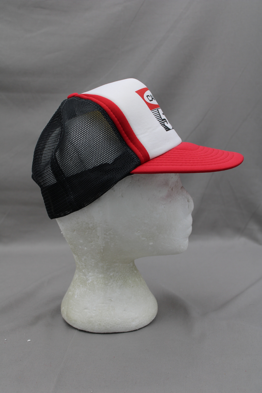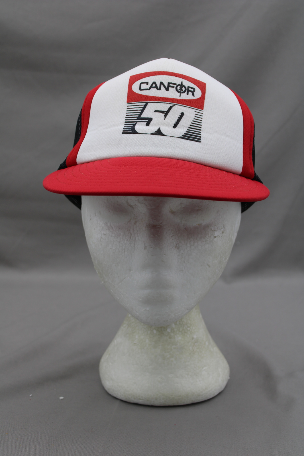 Up for sale is a vintage logging hat. It has a white front, black mesh back and a red brim. The front of the hat has Canfor 50 screened on in the same colours. What an amazing vintage hat do not miss out on it.