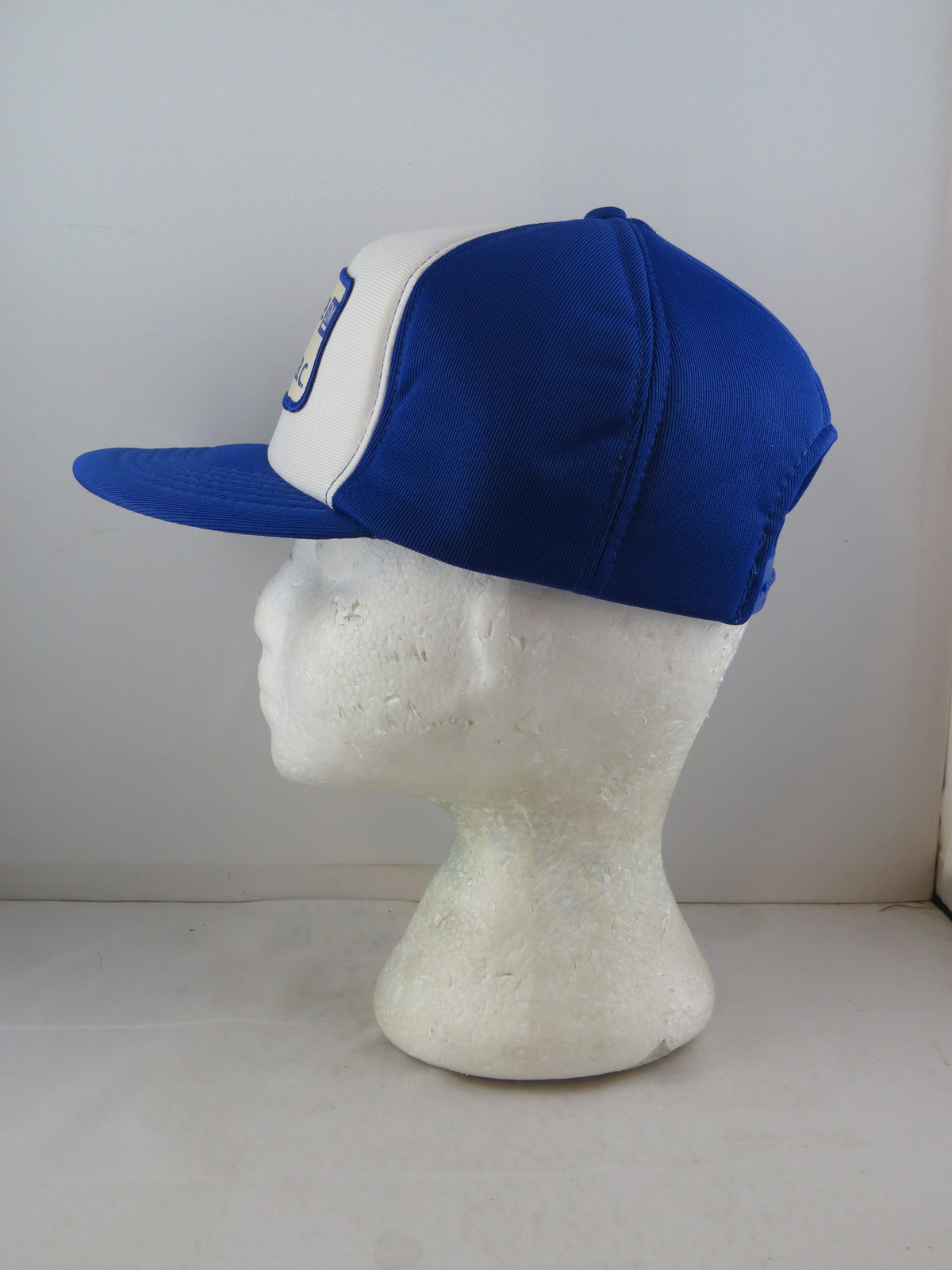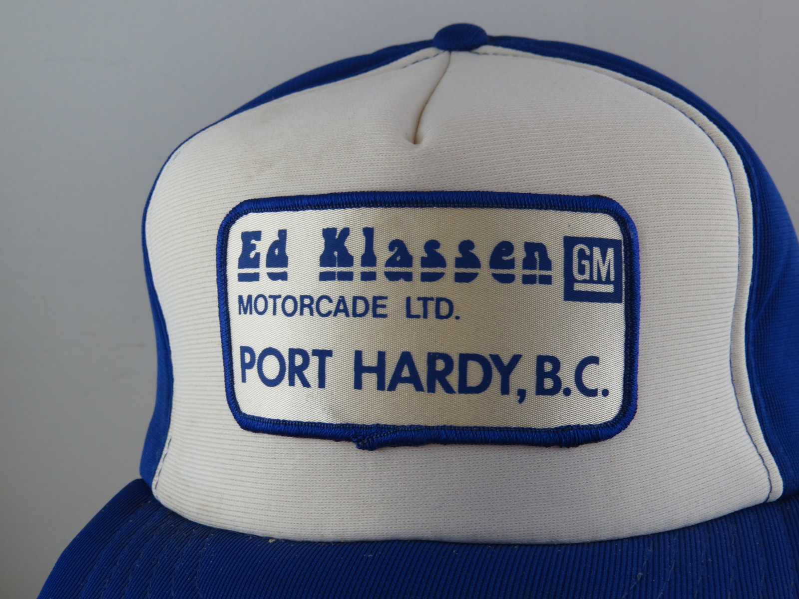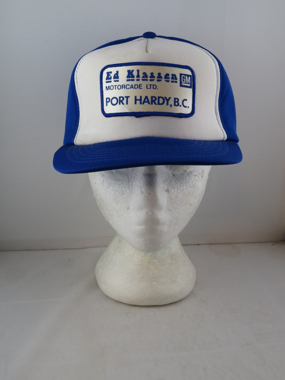 Up for sale is a vintage patched farmer hat. It has a blue back and a white front. The front of the hat has a large patch for Ed Klassen GM of Port Hardy BC. What a great vintage hat do not miss out on it.