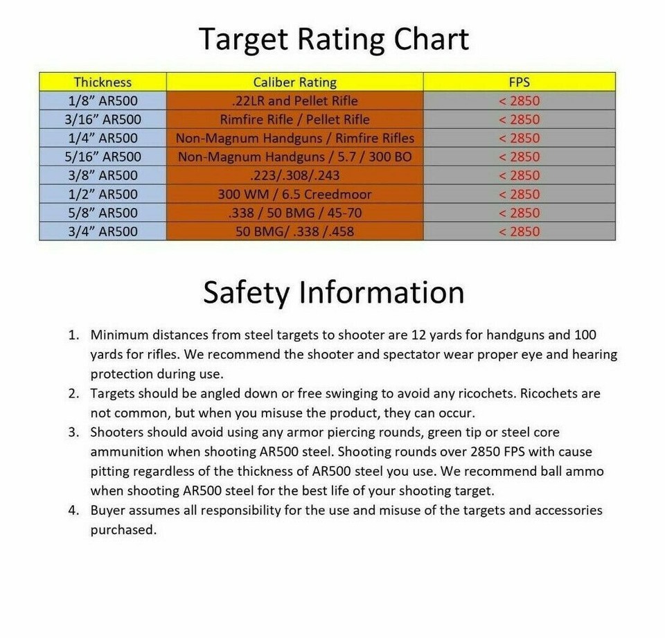 Manufactured from new high quality AR500 steel plate made in the USA