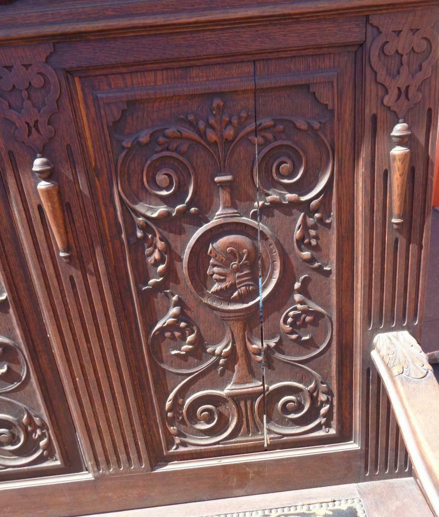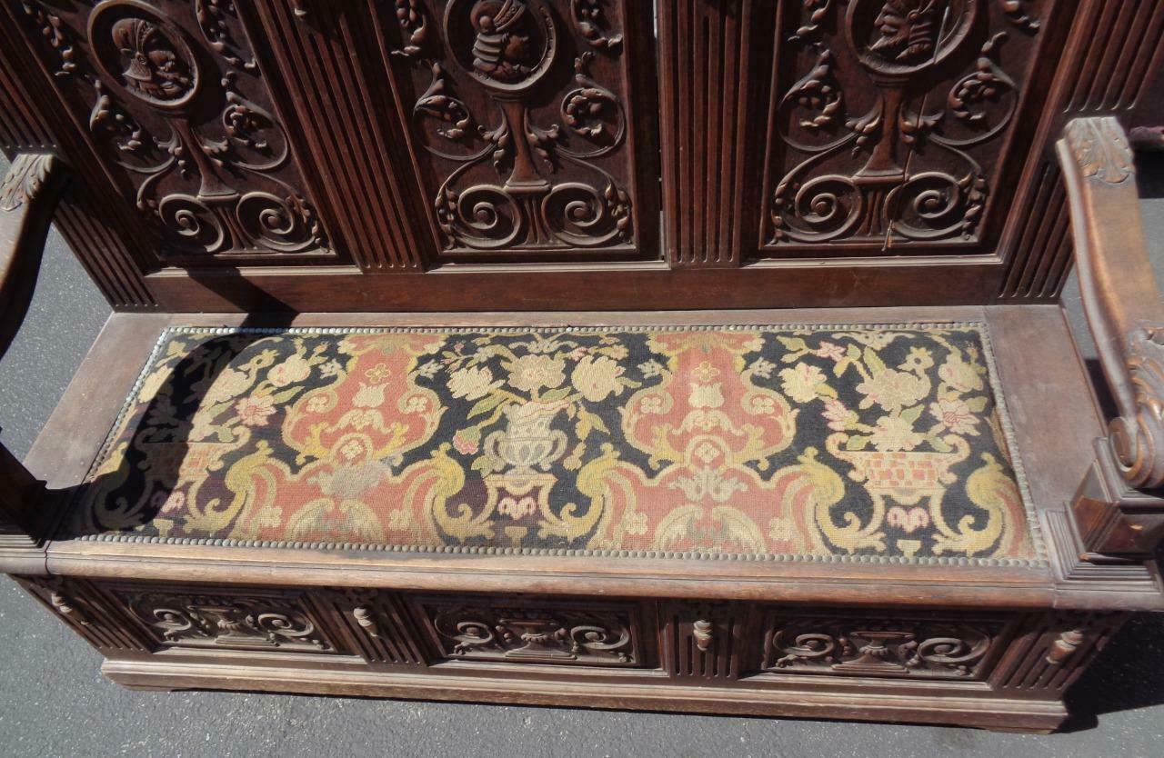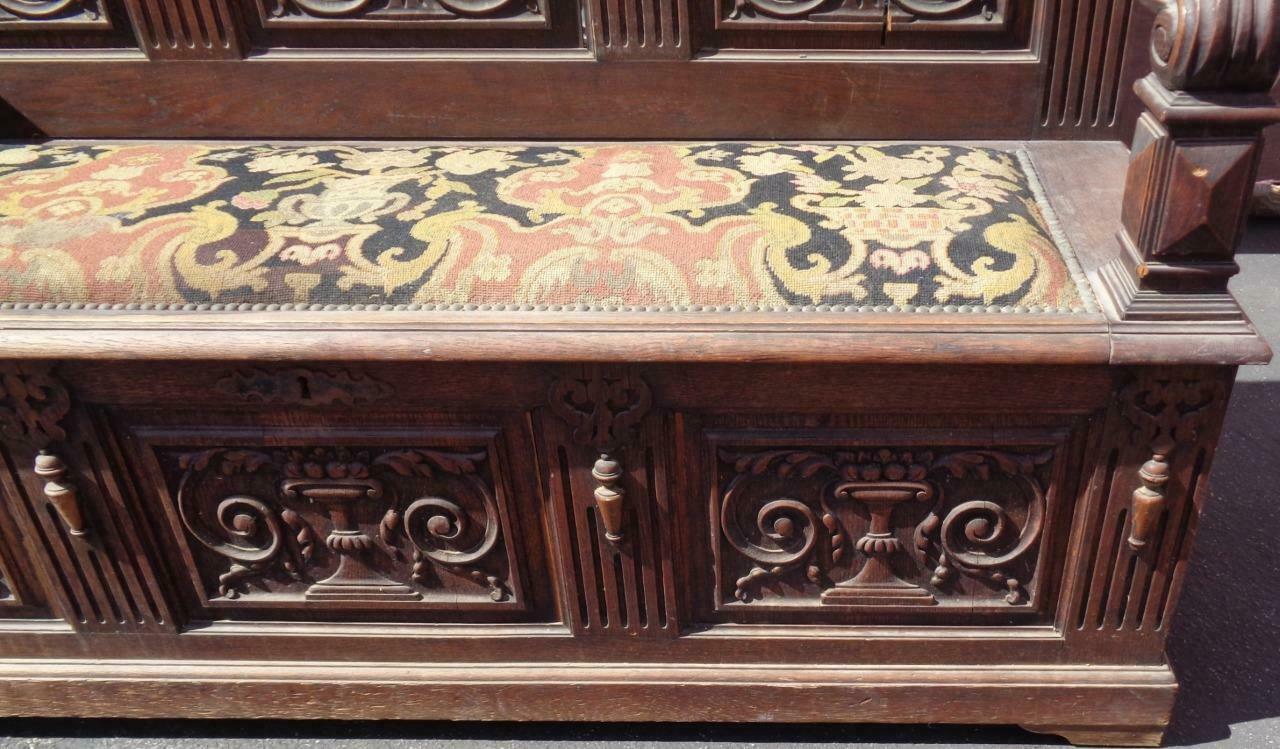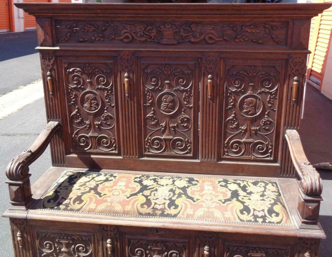 Offered here is this Amazing Antique Wooden Bench. I am unsure of the actual age of the bench; however, I would date it to the mid to late 19th Century. It still has a partial label on the bottom and was made in Belgium. The carving on this piece is exquisite. The details are absolutely amazing, and the photos do not do it justice. The wood on the back of the bench is unfortunately splitting in a few places, with several vertical splits and one or two horizontal splits towards the top. It is structurally sound, however. The needlepoint upholstered, handmade seat is in good condition, with no holes or tears in the fabric, but it is a little faded from age, and does need to be cleaned and dusted. The bench seat opens for storage, and the key for the lock is present and included. The lock works well. The bench has armrests on each end, which also have beautiful carved details. I am unsure of the type of wood that this bench is made from but would say that it is most likely walnut or mahogany. It is hard and heavy. The bench does have some light surface scratches and some dings on it, which would be typical of a piece of furniture that has been around for over a century. The panels in the front of the seat are also beginning to split slightly. There is a small piece of trim at the side of the back that has come loose and will need to be put back on. The hardware on the bench and the key are original. The bench is 57” tall, 65” wide, 20.25” wide at the seat, 18” high at the seat, 19” deep at the seat. This is a gorgeous piece of craftsmanship, a MUST HAVE for any Victorian collection.
