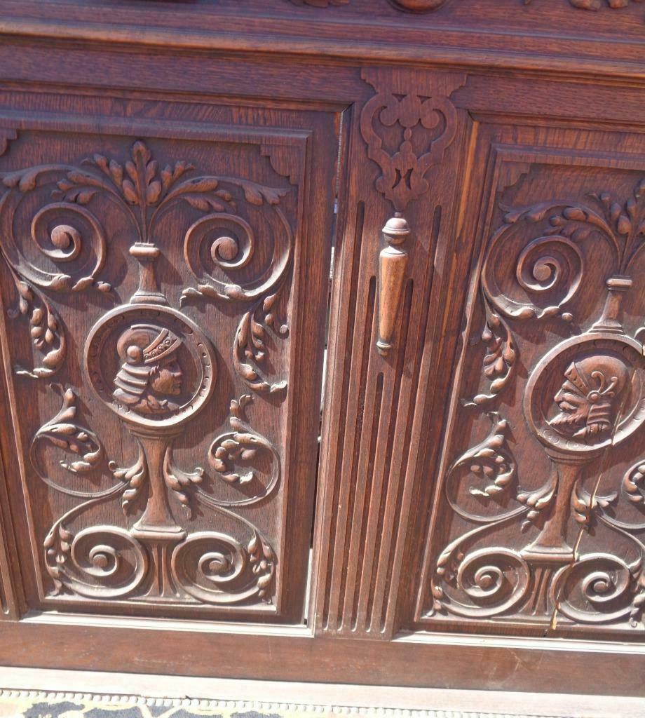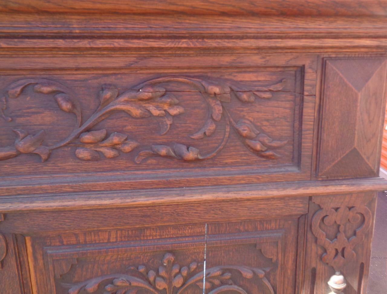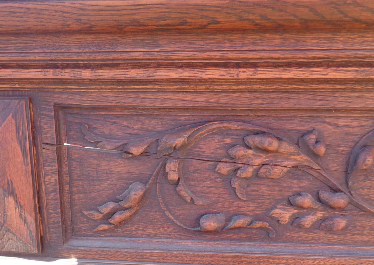 Offered here is this Amazing Antique Wooden Bench. I am unsure of the actual age of the bench; however, I would date it to the mid to late 19th Century. It still has a partial label on the bottom and was made in Belgium. The carving on this piece is exquisite. The details are absolutely amazing, and the photos do not do it justice. The wood on the back of the bench is unfortunately splitting in a few places, with several vertical splits and one or two horizontal splits towards the top. It is structurally sound, however. The needlepoint upholstered, handmade seat is in good condition, with no holes or tears in the fabric, but it is a little faded from age, and does need to be cleaned and dusted. The bench seat opens for storage, and the key for the lock is present and included. The lock works well. The bench has armrests on each end, which also have beautiful carved details. I am unsure of the type of wood that this bench is made from but would say that it is most likely walnut or mahogany. It is hard and heavy. The bench does have some light surface scratches and some dings on it, which would be typical of a piece of furniture that has been around for over a century. The panels in the front of the seat are also beginning to split slightly. There is a small piece of trim at the side of the back that has come loose and will need to be put back on. The hardware on the bench and the key are original. The bench is 57” tall, 65” wide, 20.25” wide at the seat, 18” high at the seat, 19” deep at the seat. This is a gorgeous piece of craftsmanship, a MUST HAVE for any Victorian collection.